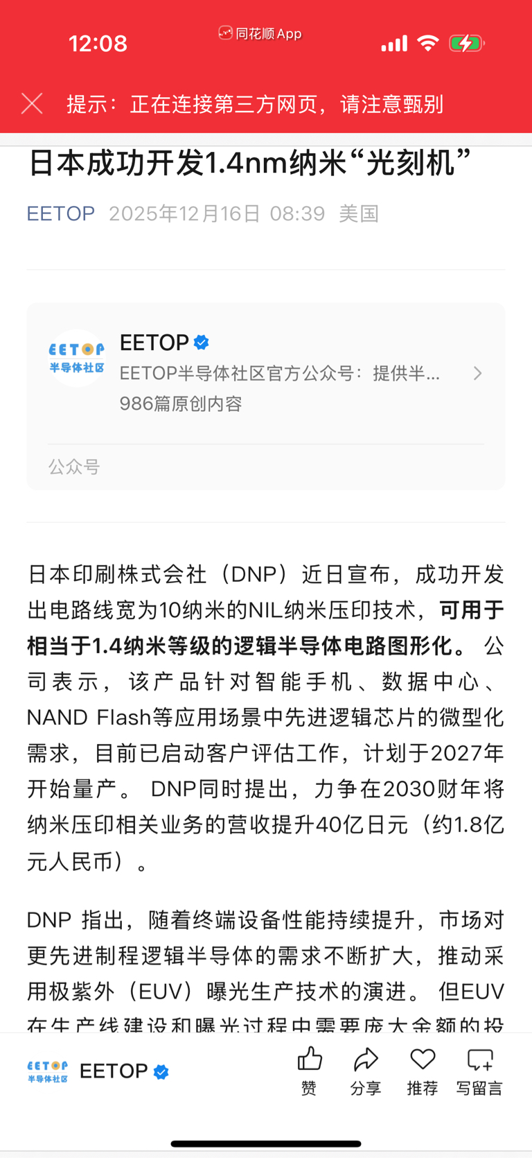 $苏大维格(SZ300331)$ 纳米压印利好来了,日本开发出1.4nm纳米光刻机,明天设备展出!