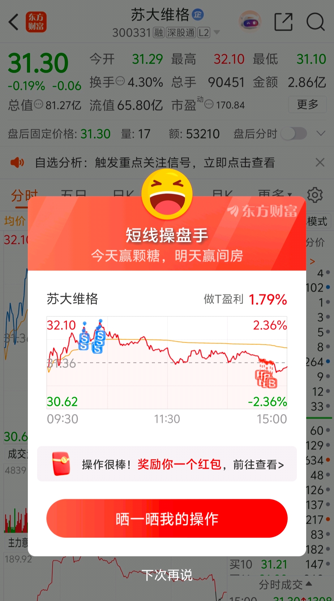 $苏大维格(SZ300331)$ 前交易日格局了没动,今天就猜与前两交易日一样了,T得刚刚好