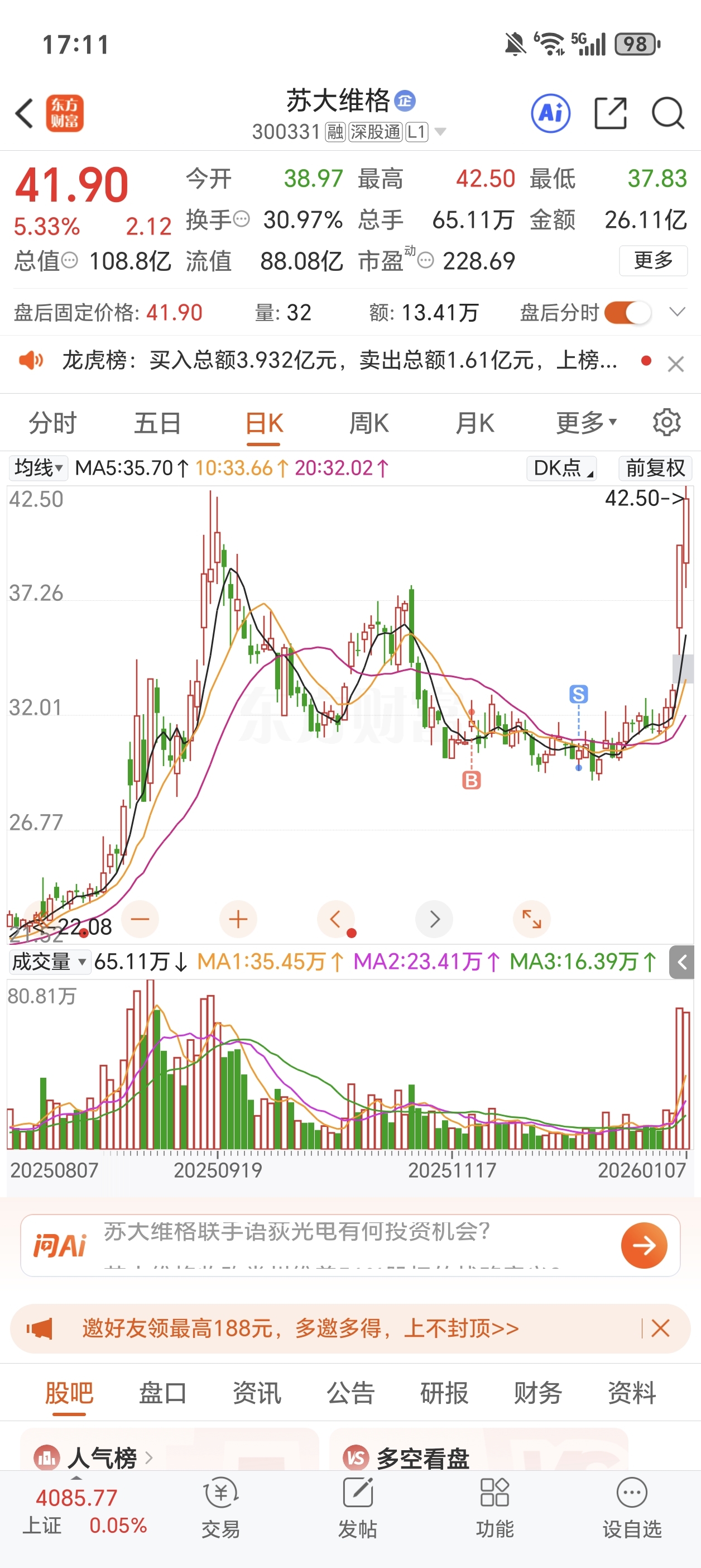 $苏大维格(SZ300331)$ 吗的,33买的,29卖的,两周你就涨到40多