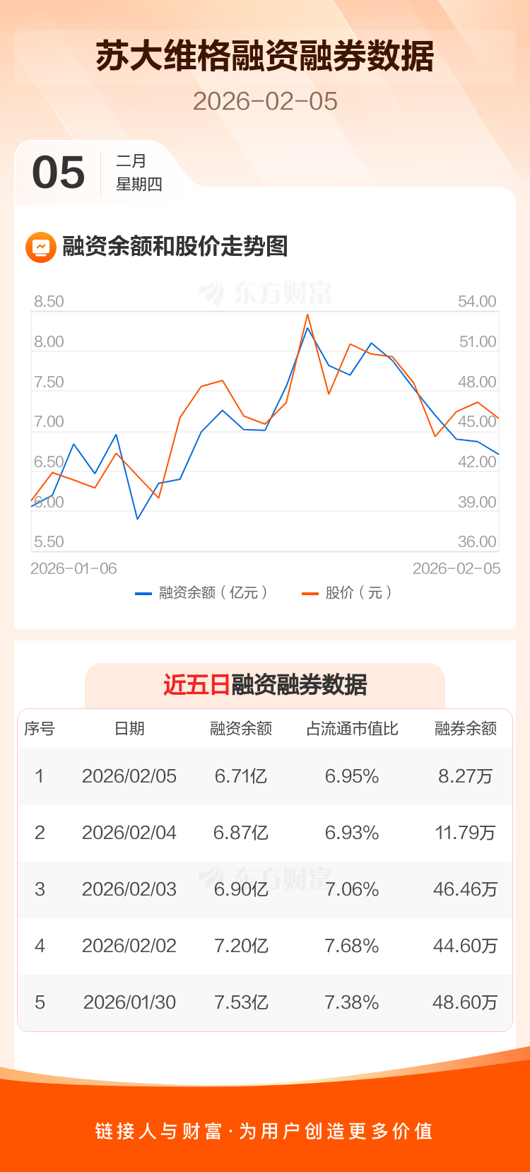 交易所最新数据显示,苏大维格于2026年2月5日获融资买入1494.91万元,融资偿还3089.60万元,当日融资净偿还1594.69万元。目前,该股融资余额6.71亿,占流通市值比例为6.95%。