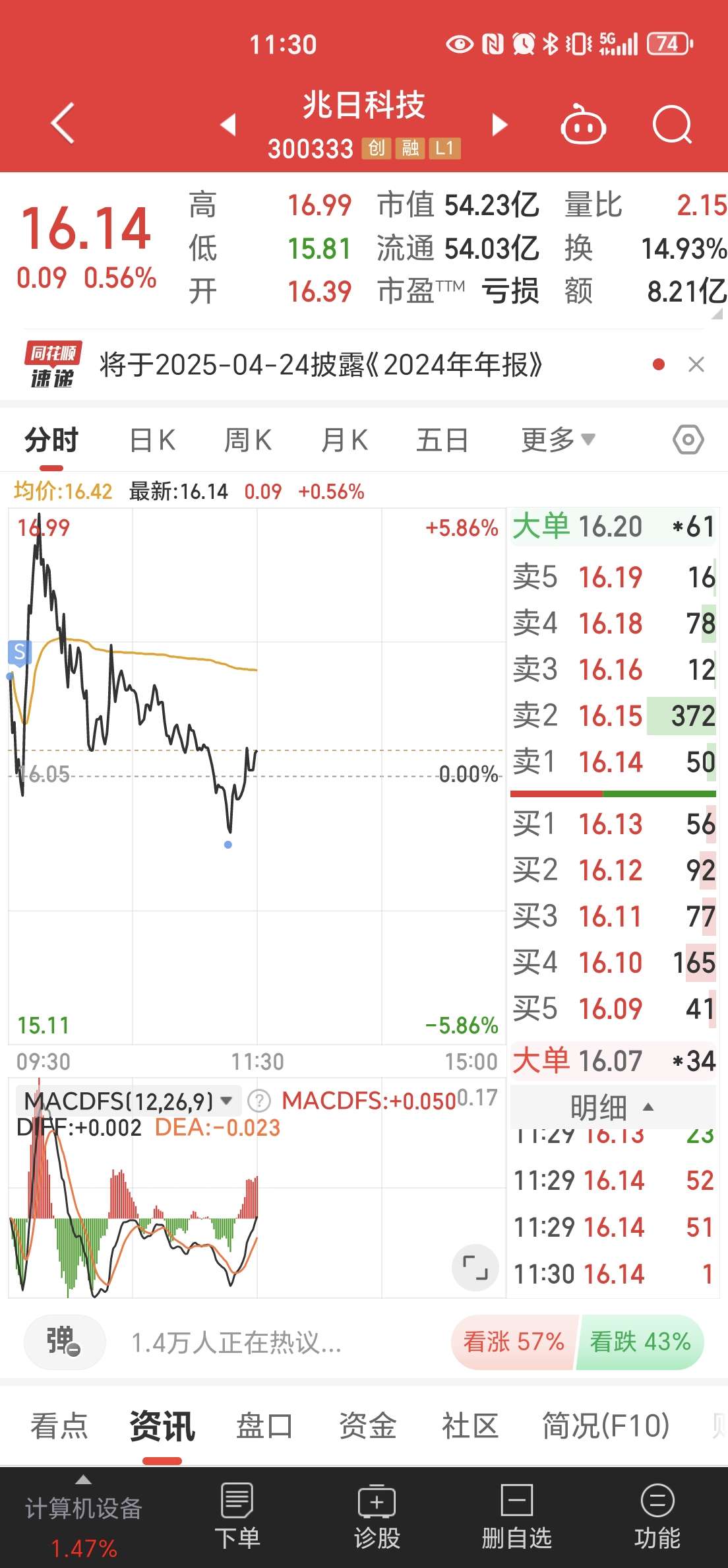 $兆日科技(SZ300333)$ 挂单16.88撤单了,精准割在15.81,沟槽的!