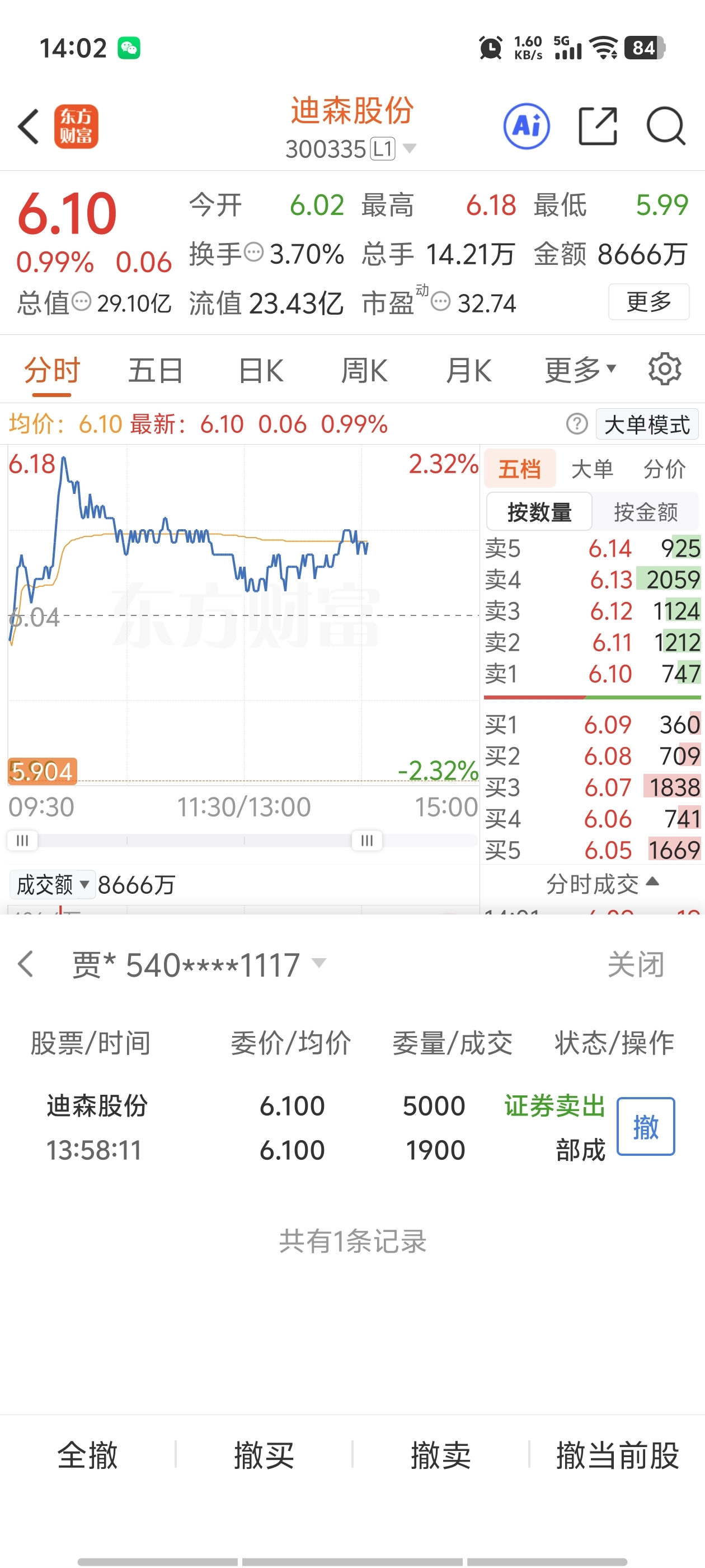 $迪森股份(SZ300335)$ 卖这么点。一手两手的卖掉的