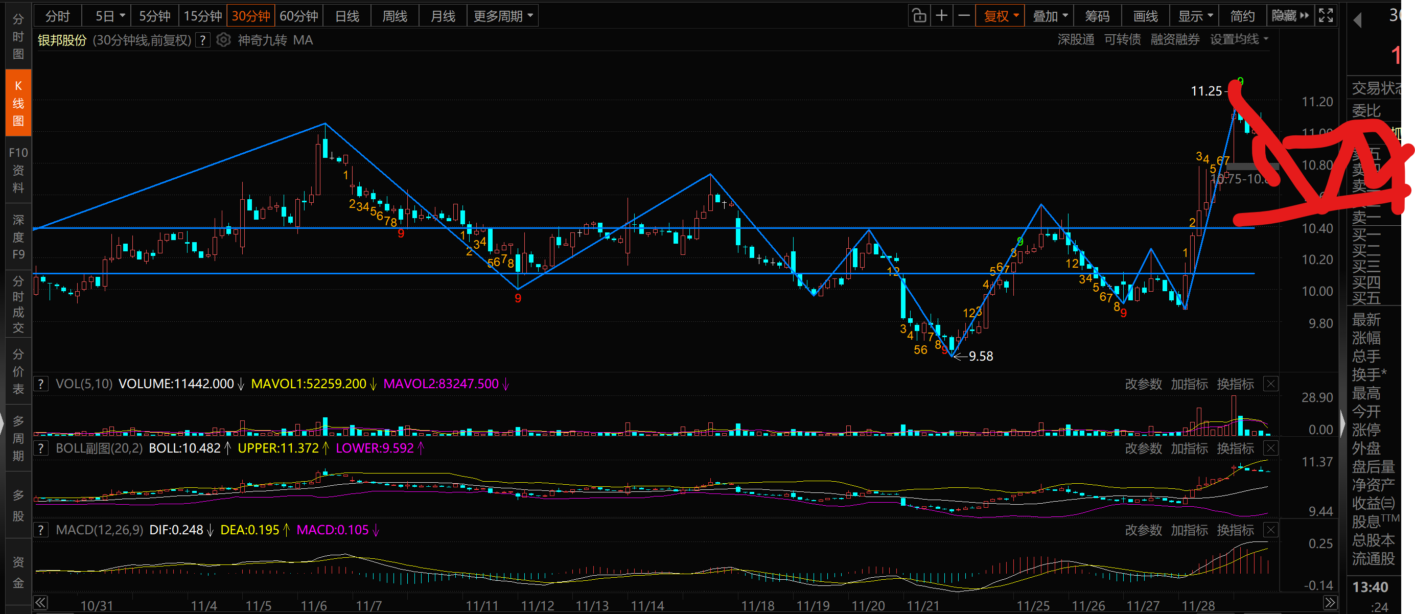 30分钟走势中枢上沿就是 10.39 上次 11.05分 被 拉回后 这次突破到 11.25 . 看看会怎么走
