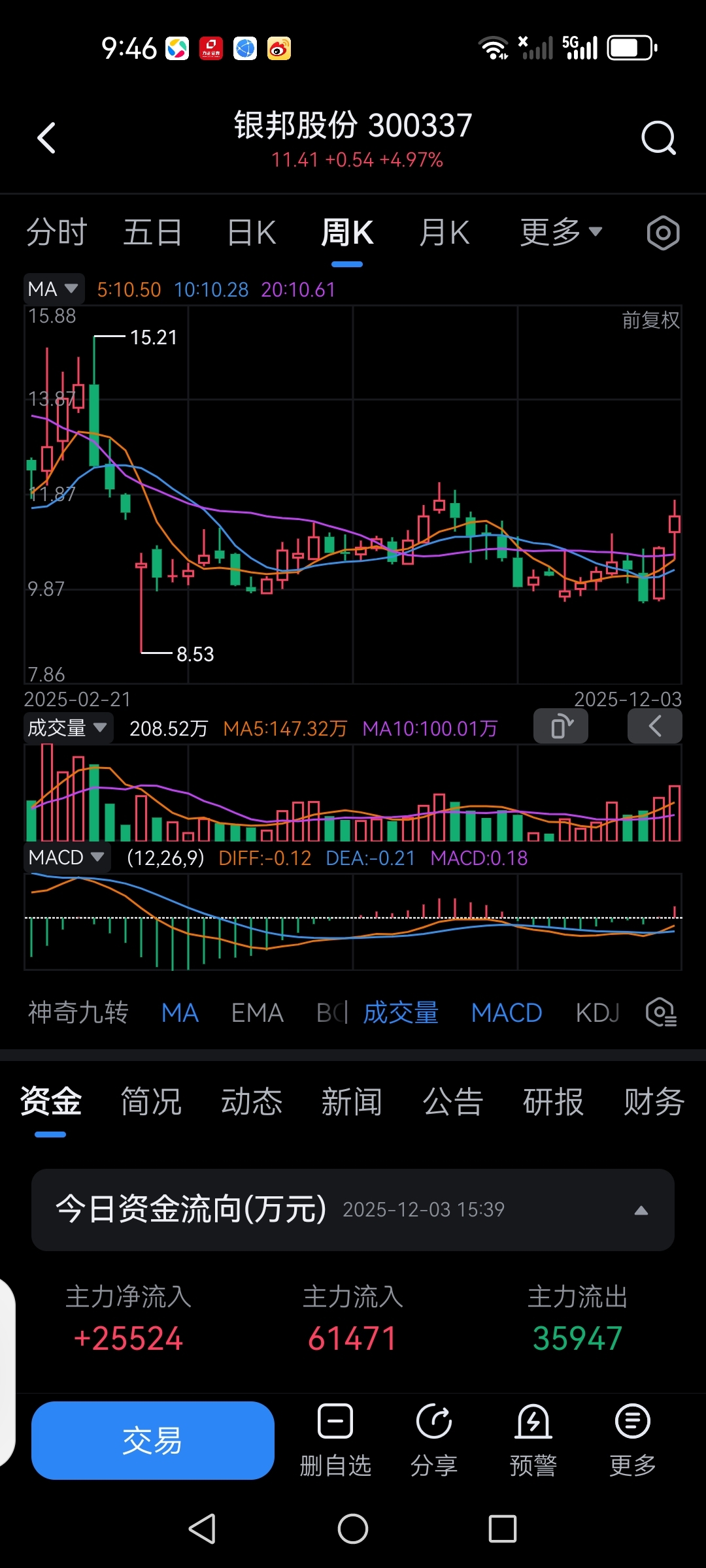 $银邦股份(SZ300337)$ 商业航天3D打印龙头十华为mate80热销十铝金属期货大涨,三重热门概念聚集,主力资金大幅流入,先看年初高点15元!