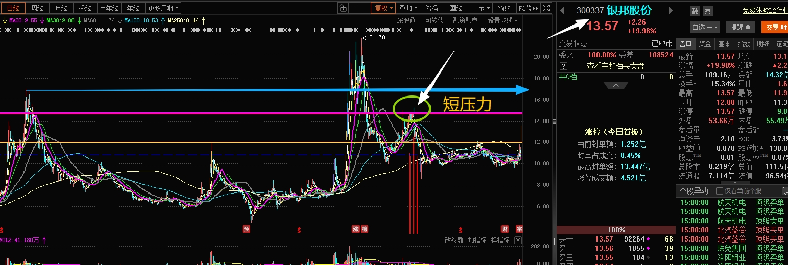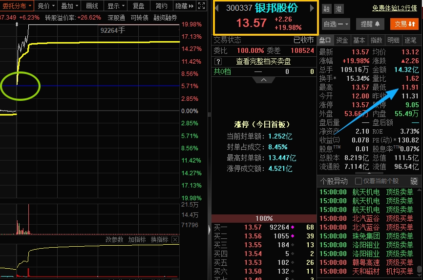 应股友需求;解析 300337 银邦股份 早盘 高开 快速 回撤 支撑 箱体底部12元附近 寻求 买盘后 向上反弹打板