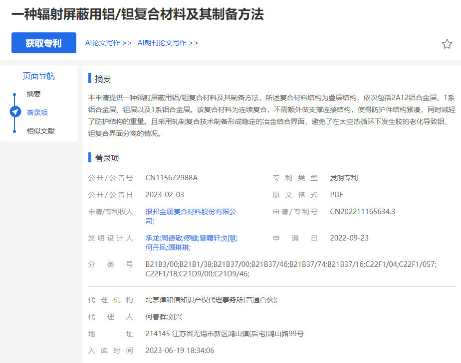 银邦股份:太空抗辐射铝/钽复合材料专利解析