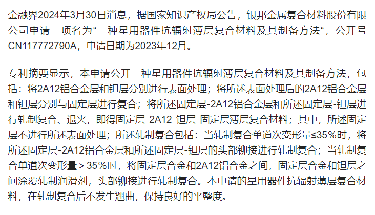 银邦股份:据国家知识产权局公告,银邦金属复合材料股份有限公司申请一项名为“一种星用器件抗辐射薄层复合材料及其制备方法“,公开号CN117772790A,申请日期为2023年12月。