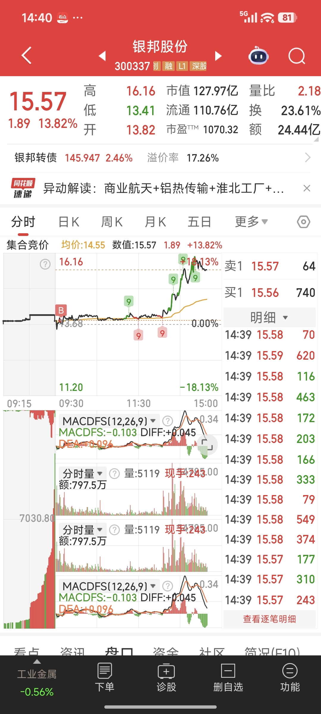 $银邦股份(SZ300337)$ 16.16对子顶。今天买点到明天都不晓得有五个点利润不