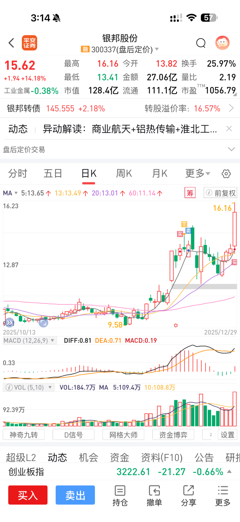 $银邦股份(SZ300337)$ 红三兵之后今天放量突破平台,理论上转强了,咱不贪,节前三个交易日主力给车上的朋友发个大红包吧