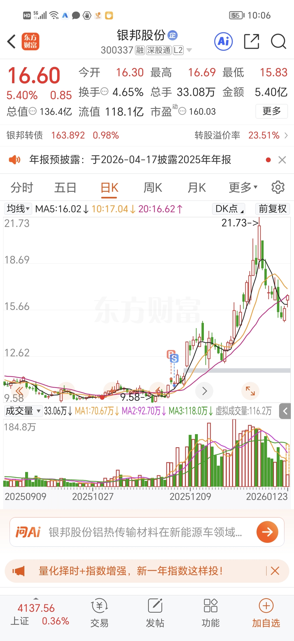 $银邦股份(SZ300337)$ 银邦股份以前我亏了很多,前段时间9块我买了。那天也是觉得到底了该涨了。结果这个票竟然翻倍了从我买。我一直在想什么时候我能格局一个票涨一百多个点再卖。那个云意也是大亏,今天也大涨,气死我
