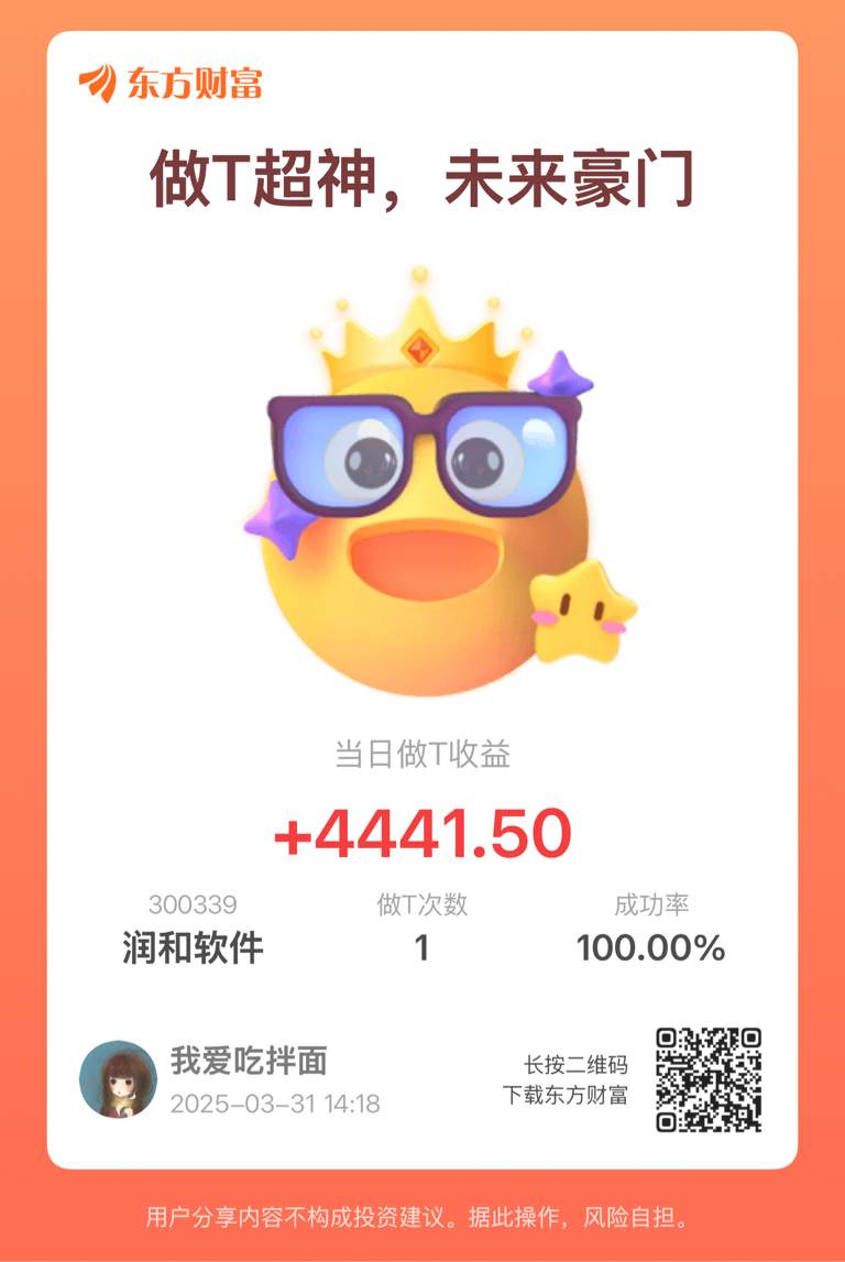 $润和软件(SZ300339)$ 早上加仓,午后做个浅浅的T,惬意温馨。明天继续加仓,无脑喷韭只能继续吃面