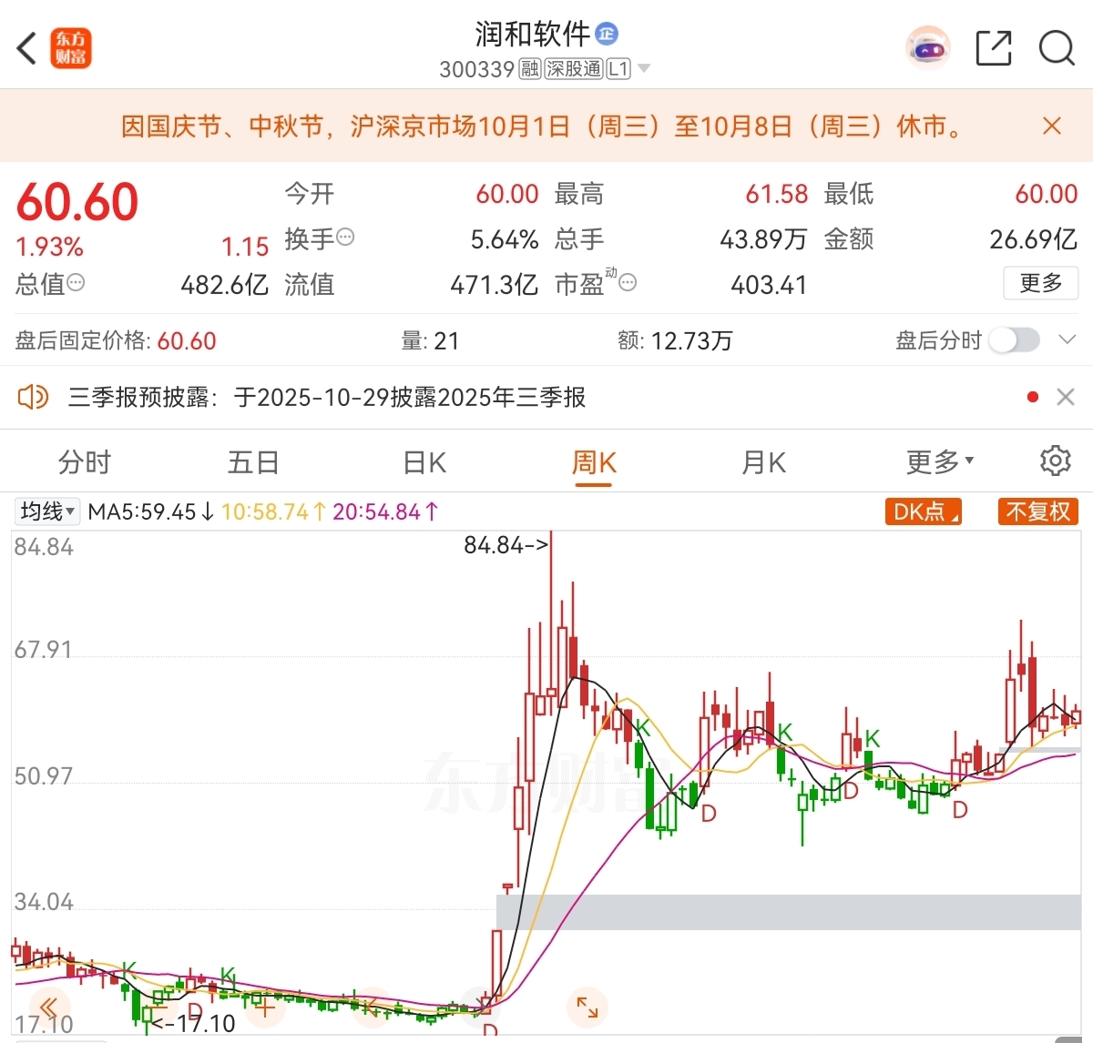 $润和软件(SZ300339)$ 前高84.84,现收盘60.60。主力这么喜欢玩对子?