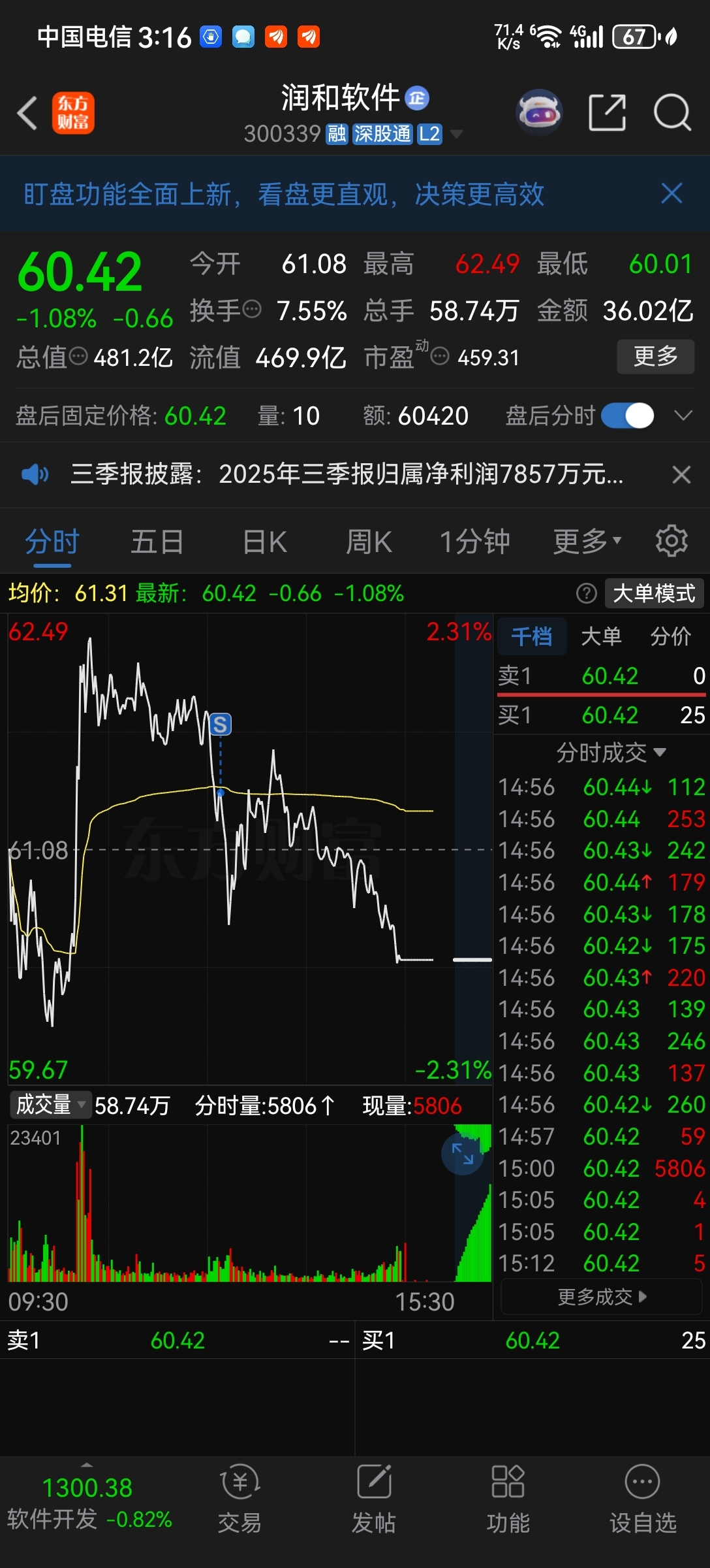 $润和软件(SZ300339)$ 差点今儿又亏钱了