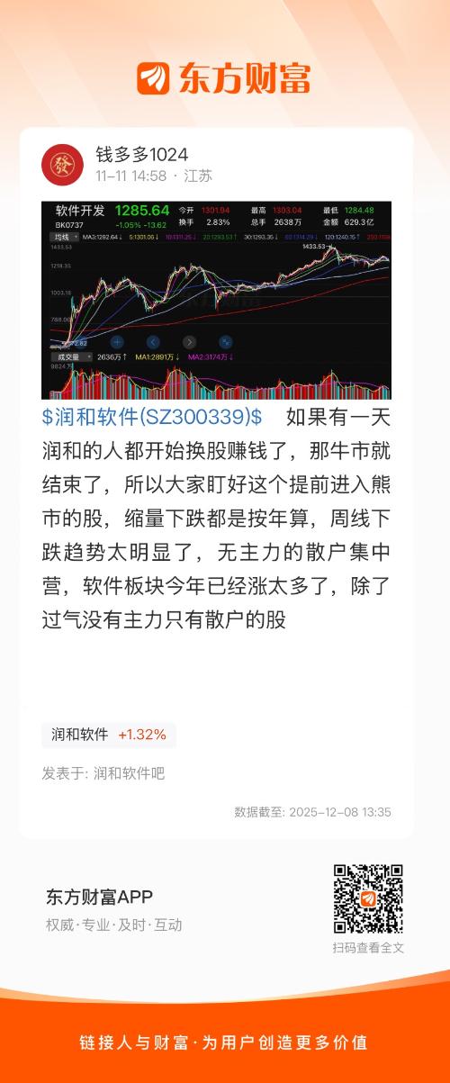 $润和软件(SZ300339)$ 如果有一天润和的人都开始换股赚钱了,那牛市就结束了,所以大家盯好这个提前进入熊市的股,缩量下跌都是按年算,周线下跌趋势太明显了,无主力的散户集中营,软件板块今年已经涨太多了,除了过气没有主力只有散户的股