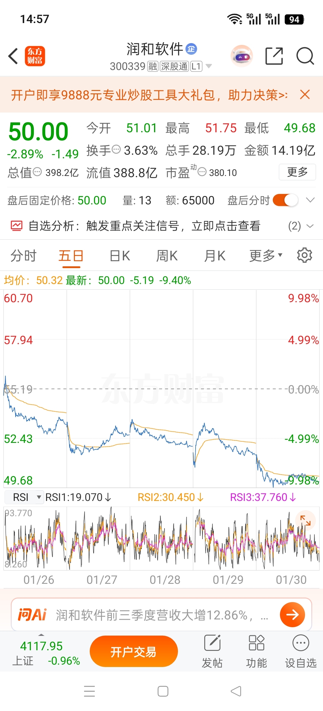 一周股价跌了5元多,哪个散户扛的牢?何况在大盘4100多点的牛市大背景下,润和今