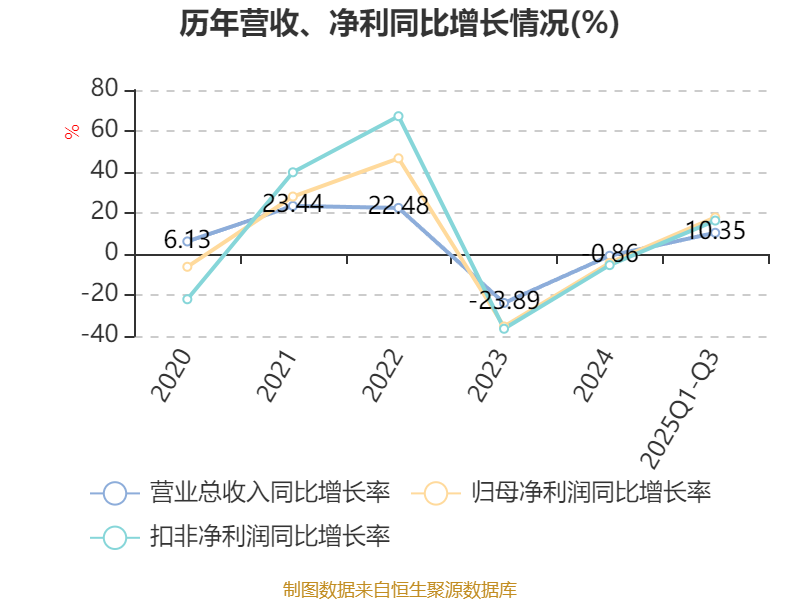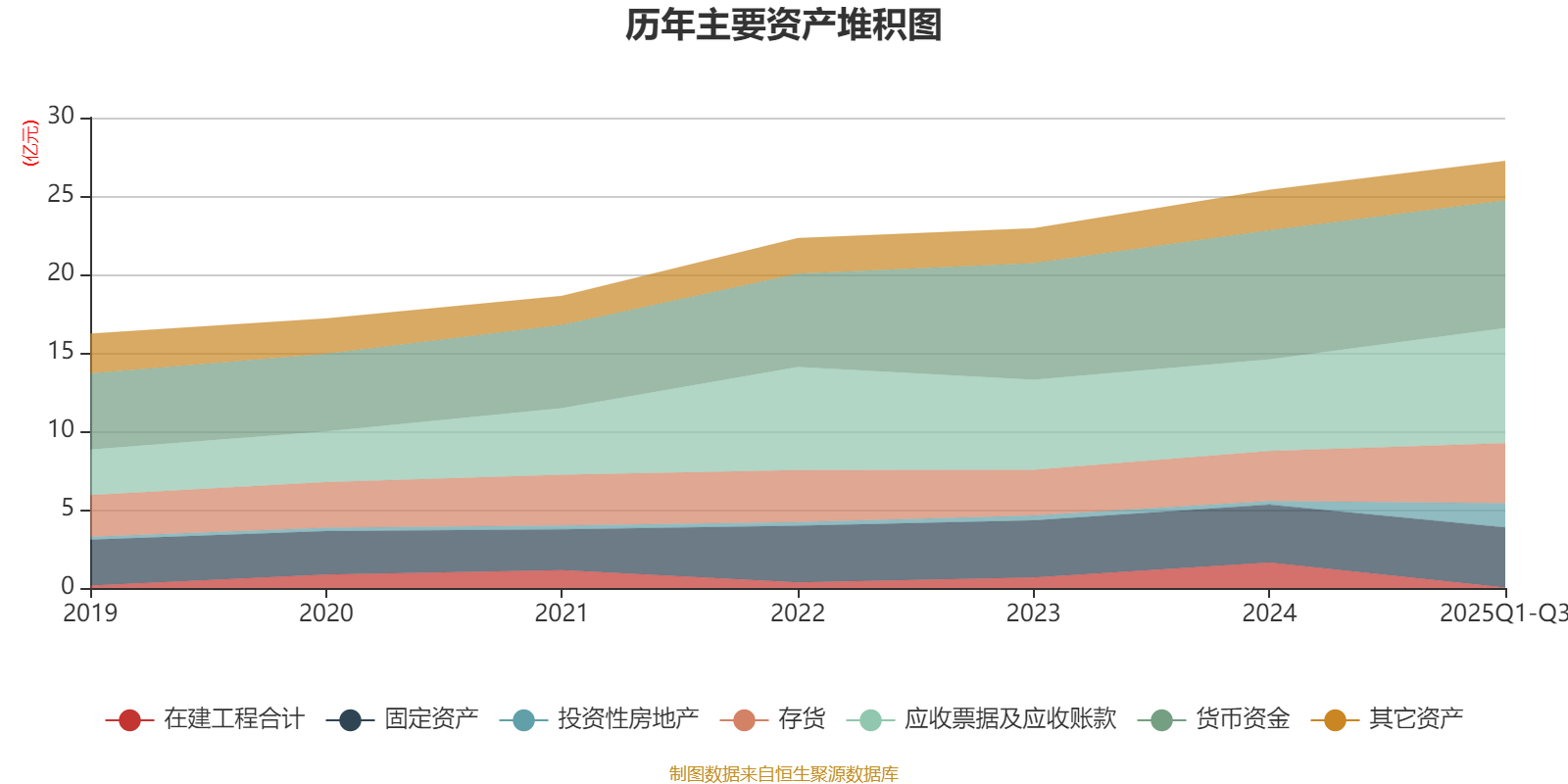 资产重大变化方面,截至2025年三季度末,公司在建工程合计较上年末减少97.76%,占公司总资产比重下降6.24个百分点;投资性房地产较上年末增加576.3%,占公司总资产比重上升4.77个百分点;应收票据及应收账款较上年末增加25.45%,占公司总资产比重上升3.9个百分点;货币资金较上年末减少1.23%,占公司总资产比重下降2.58个百分点。