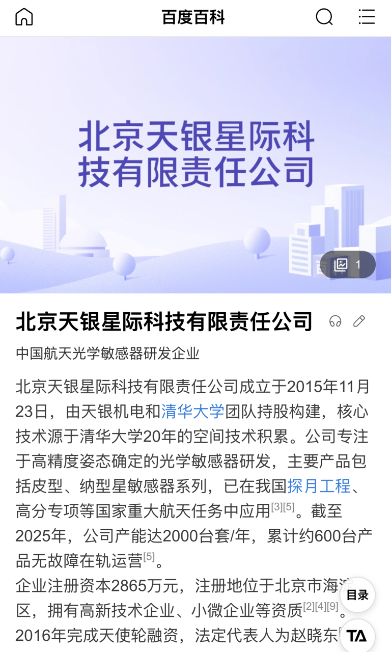 截至2025年7月31日,天银星际的星敏感器产品已成功落地并在轨运营700多台在轨无故障运行。