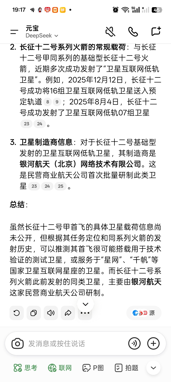 $天银机电(SZ300342)$ 不知道长征十二号甲能不能成功回收,如果成功回收的话对天银星际还是比较有利的,长征十二号毕竟都是用的银河航天的卫星,天银星际又是银河航天的供应商,回收成功发射更本低而且周期大幅度缩短,上去的卫星自然也就多了,星敏感器也是必不可少的。马斯克的SpaceX,IPO也是因为卫星发射需要很烧钱,而且送上去了就不会下来成本降无可降。