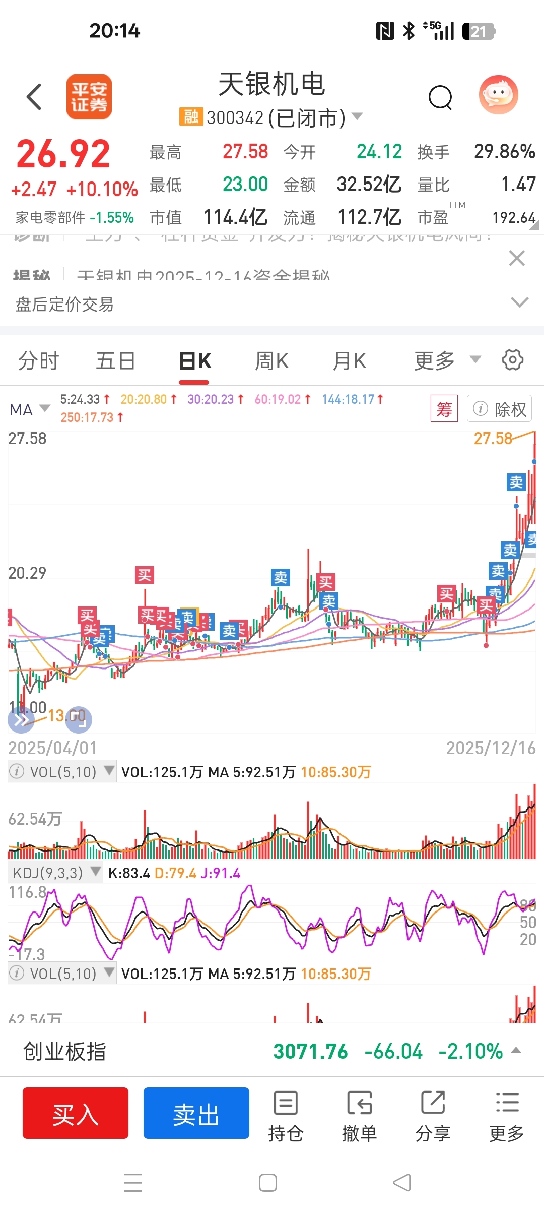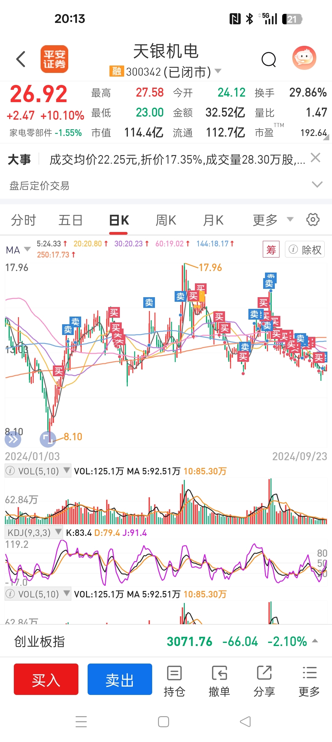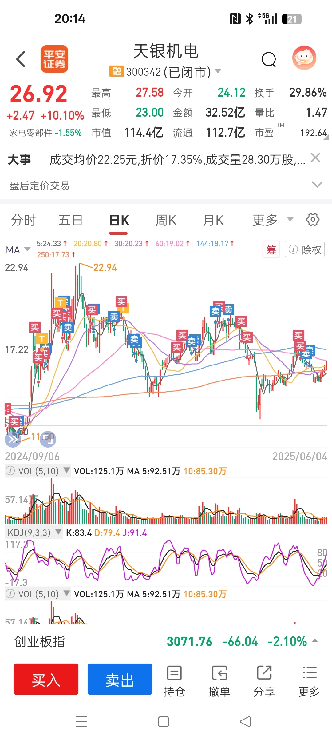 $天银机电(SZ300342)$ #复盘记录# 从24年2月开始买你,那时候才八九块钱,今天7个点清了最后的底仓,本来是打算留到你三十多再走的!陪伴这么久多少有些小伤感!发个帖子纪念一下吧,商航应该还会继续,希望你高歌猛进,挺进百元行列!