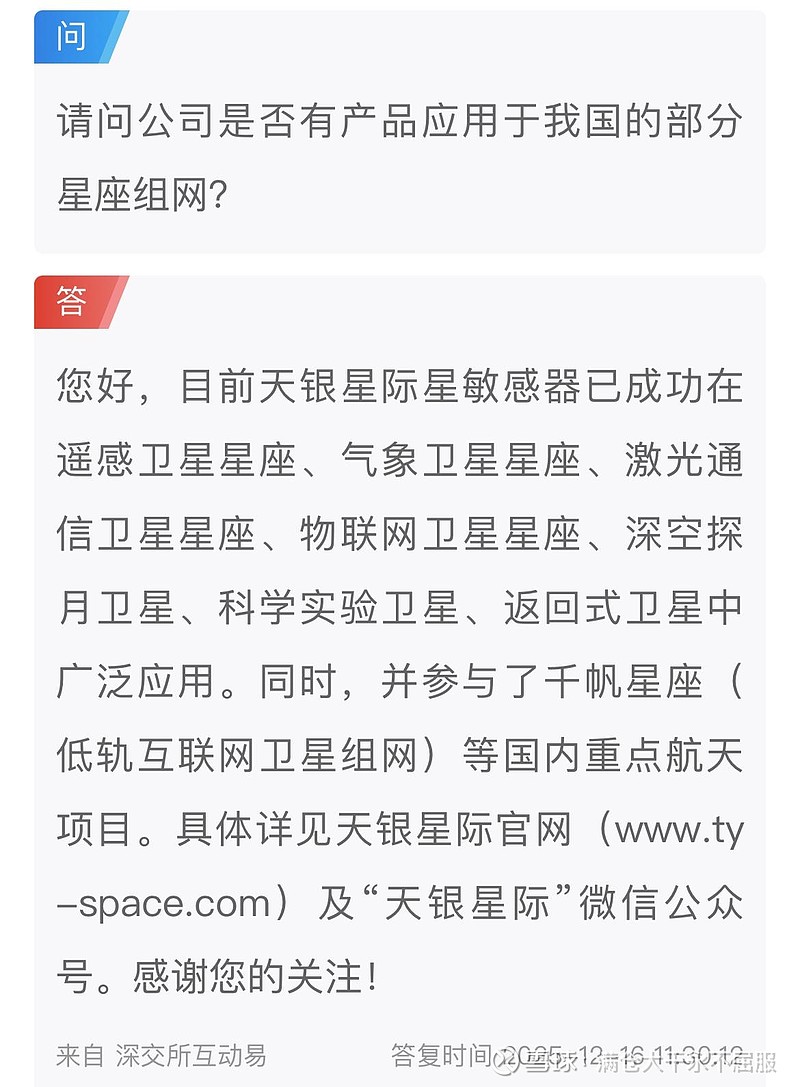 天银星际的星敏产品在商航上的应用还不错,广泛应用于星座组网,是“必不可少”的重要构成,看看董秘介绍。