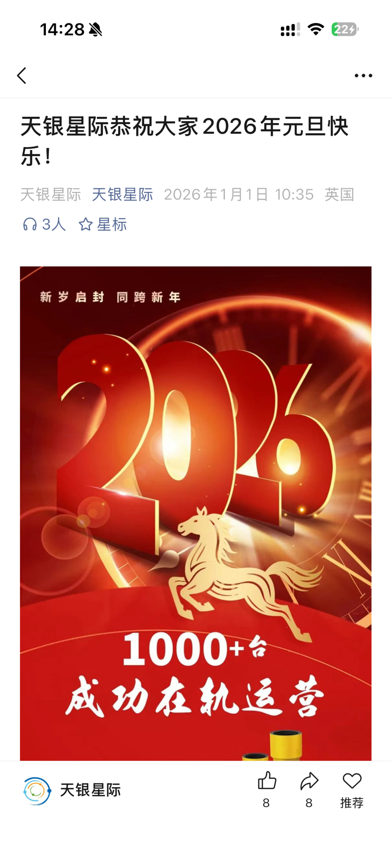 $天银机电(SZ300342)$ 天银星际的公众号发布在轨1000+,各位老师达预期吗?