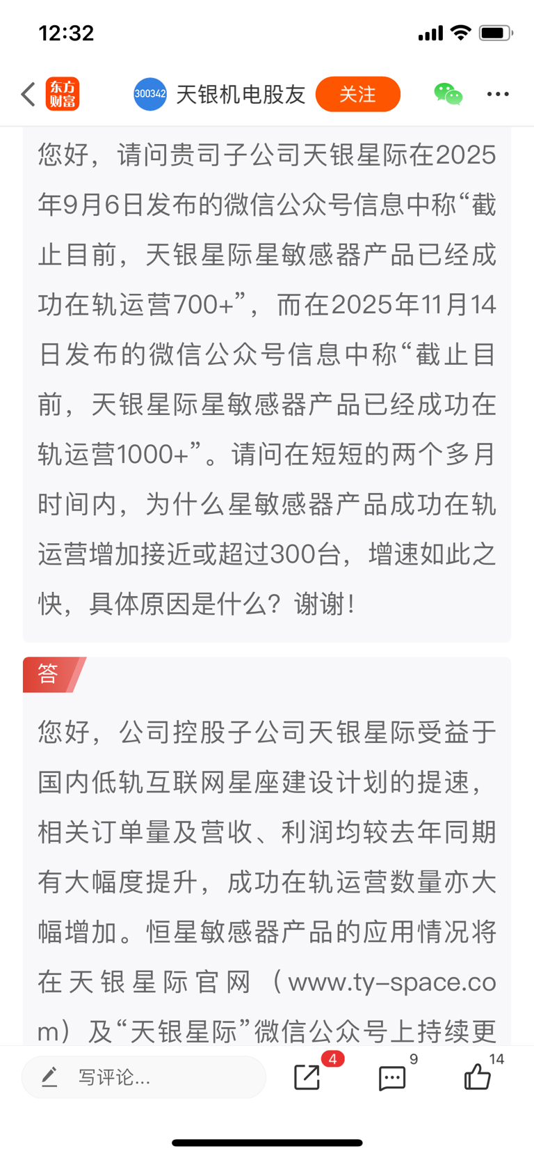 公司回应是天银星际受益于国内低轨互联网星座建设计划的提速,相关订单量及营收、利润均较去年同期有大幅度提升,成功在轨运营数量亦大幅增加。