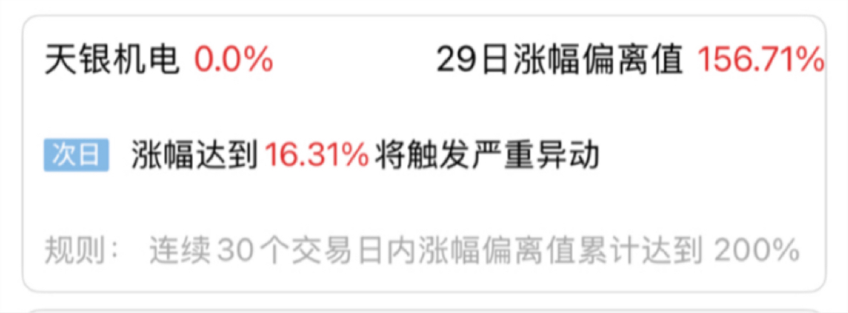 $天银机电(SZ300342)$ 这个就算涨停也没到200%啊 为什么提示涨16.31% 就要异动