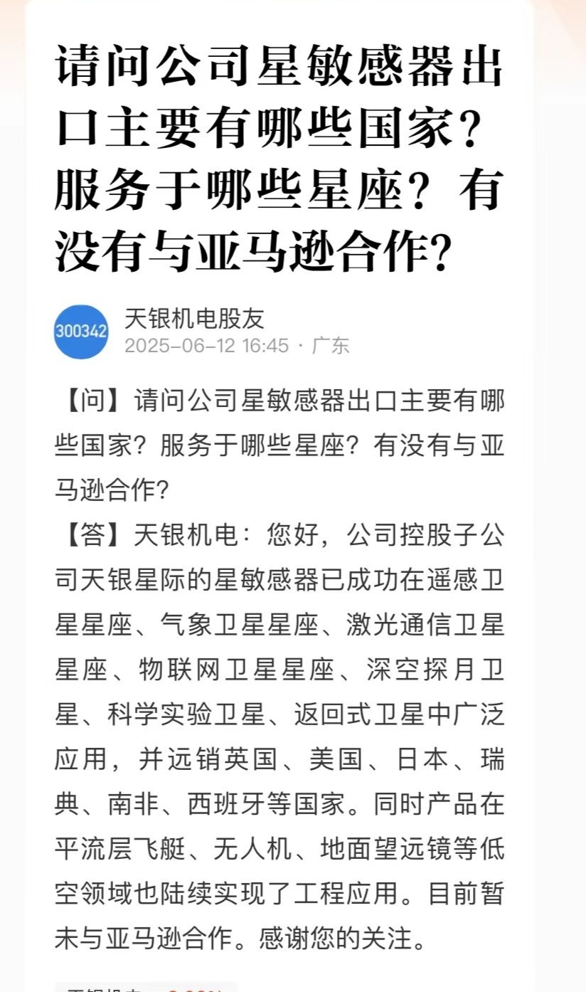 $天银机电(SZ300342)$ 天银的星敏感器虽然出口国家比较多,但是公司明确表示没有与spaceX合作,还有就是出口的金额不是很大,还没有形成气候!