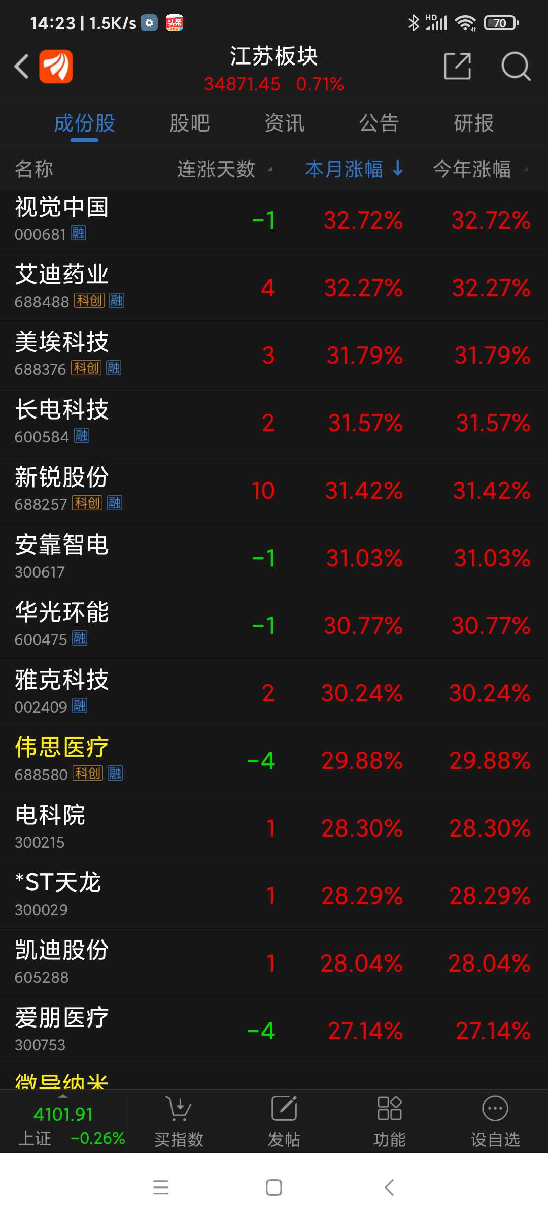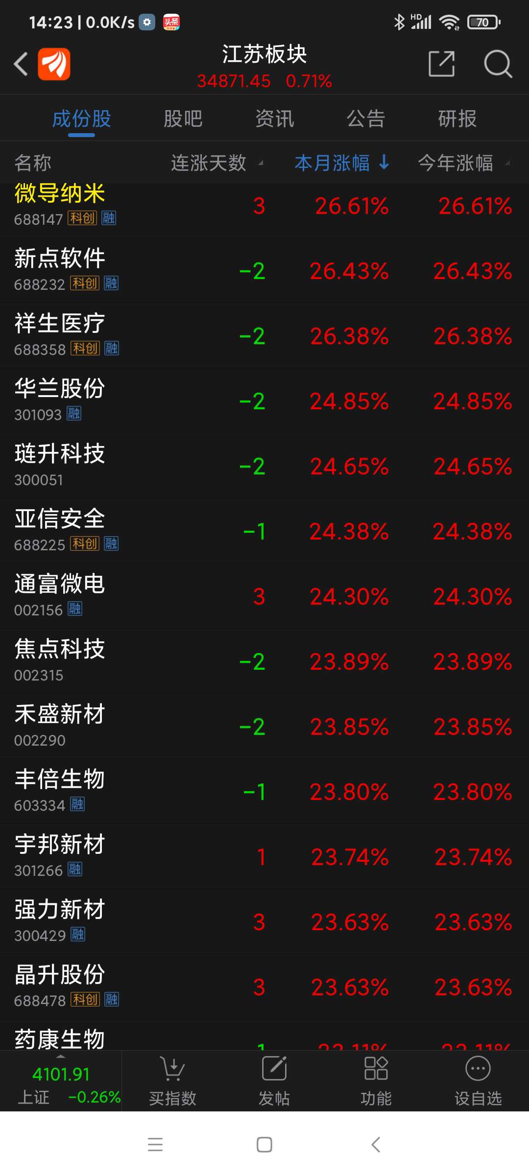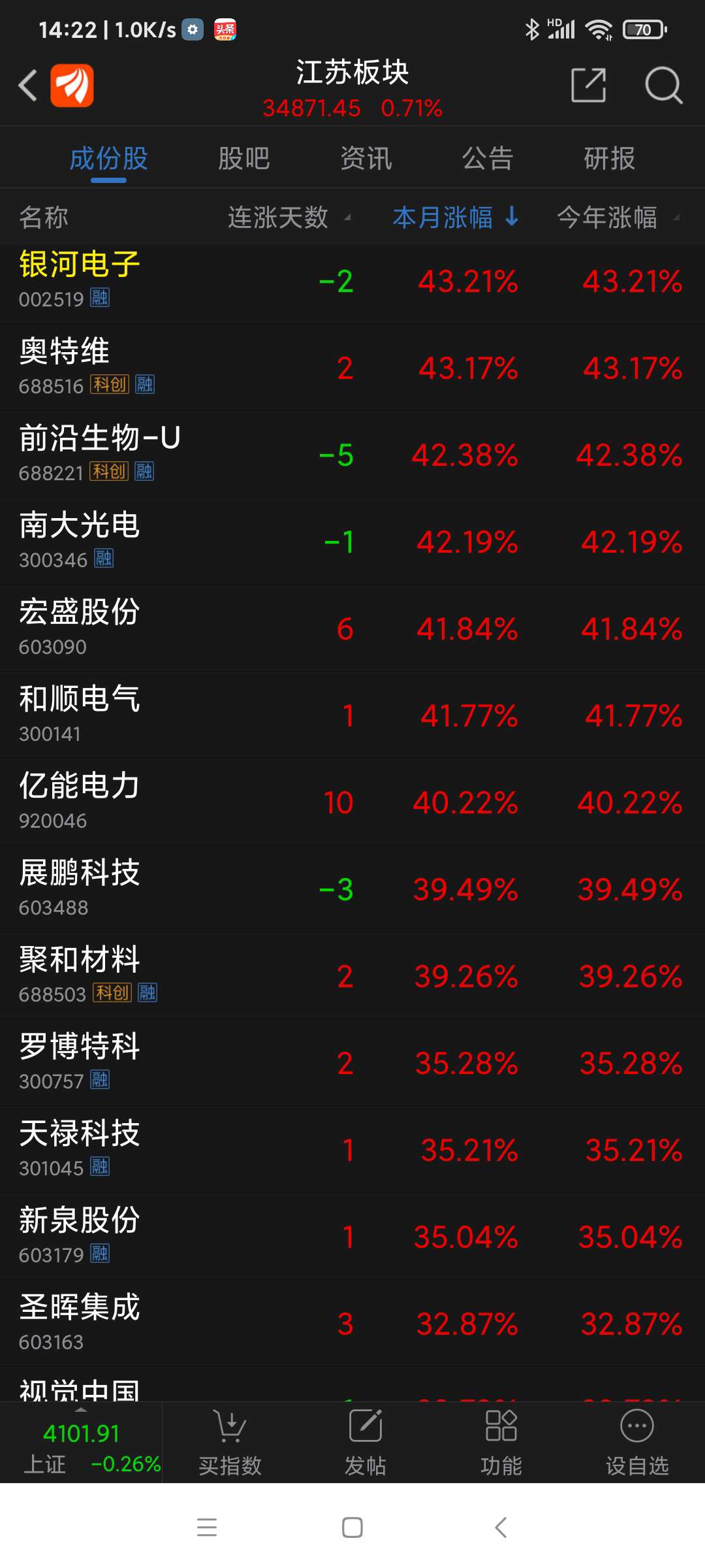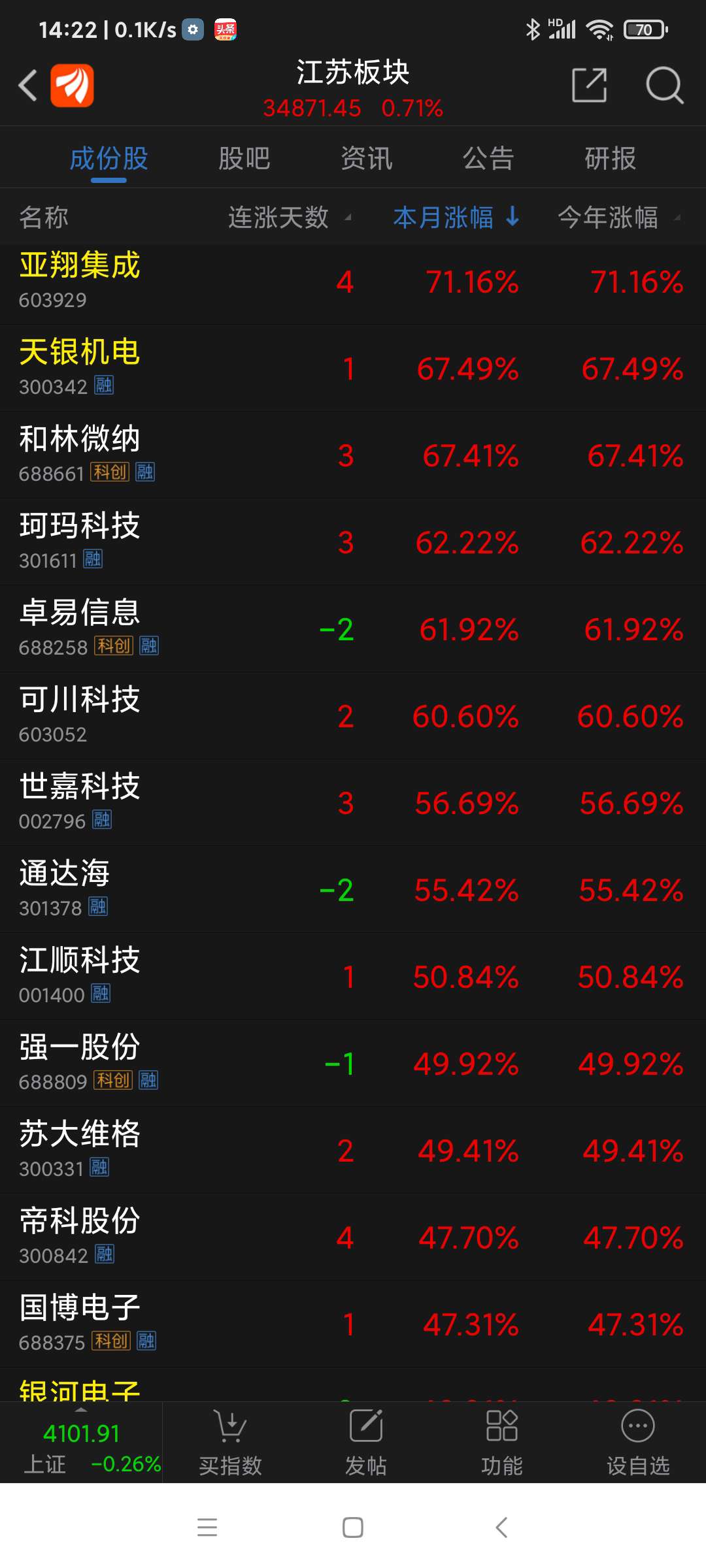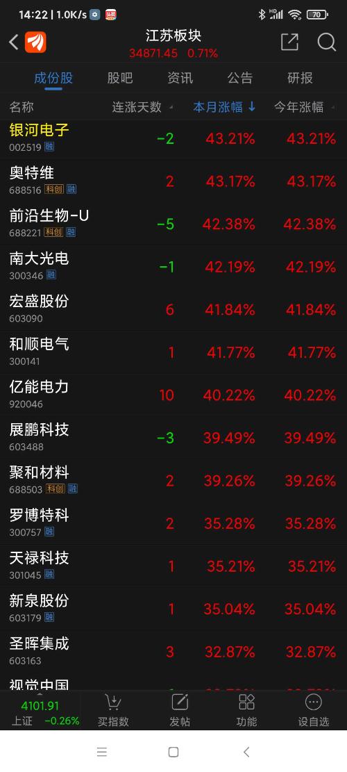 截止周五(260116)收盘,沪深股市周涨幅(省略%)居前各股分别为:博菲电气61.06,通源环境58.66,蓝箭电子57.66,易点天下(周四停牌)54.34,宝莱特48.76,佰维存储45.85,帝科股份43.13,天银机电41.20,湖南白银41.14,艾可蓝40.53,通达海39.73,利欧股份(周五停牌)39.41,交运股份39.32,德才股份34.88,新华百货34.24,德邦股份33.05,世嘉科技32.39,人民网31.83,新风光31.05,亚翔集成30.25,中钢洛耐30.08,汉朔科技29.78,壹网壹创29.50,宏盛股价29.47,杰创智能28.95,石基信息28.69,光云科技28.43,七彩化学27.94,天智航-U27.67,三变科技27.60,江波龙27.36,钧达股份26.95,精测电子26.69,德龙汇能25.76,复洁科技25.35,信拜移动-U25.06,美年健康24.95,三江购物24.74,甬矽电子24.43,三维天地24.36,合合信息23.21,汇成股份23.16,先惠技术22.76,明冠新材22.17,中科星图21.74,税友股价21.70,保变电气21.36,海天瑞声21.33,锋龙股份(周三停牌)21.01,矽电股份20.91,兴业银锡20.65,值得买20.42,中国西电20.17,和林微纳20.10,万兴科技19.64,三维通信19.50,海优新材19.44,新华网18.03。