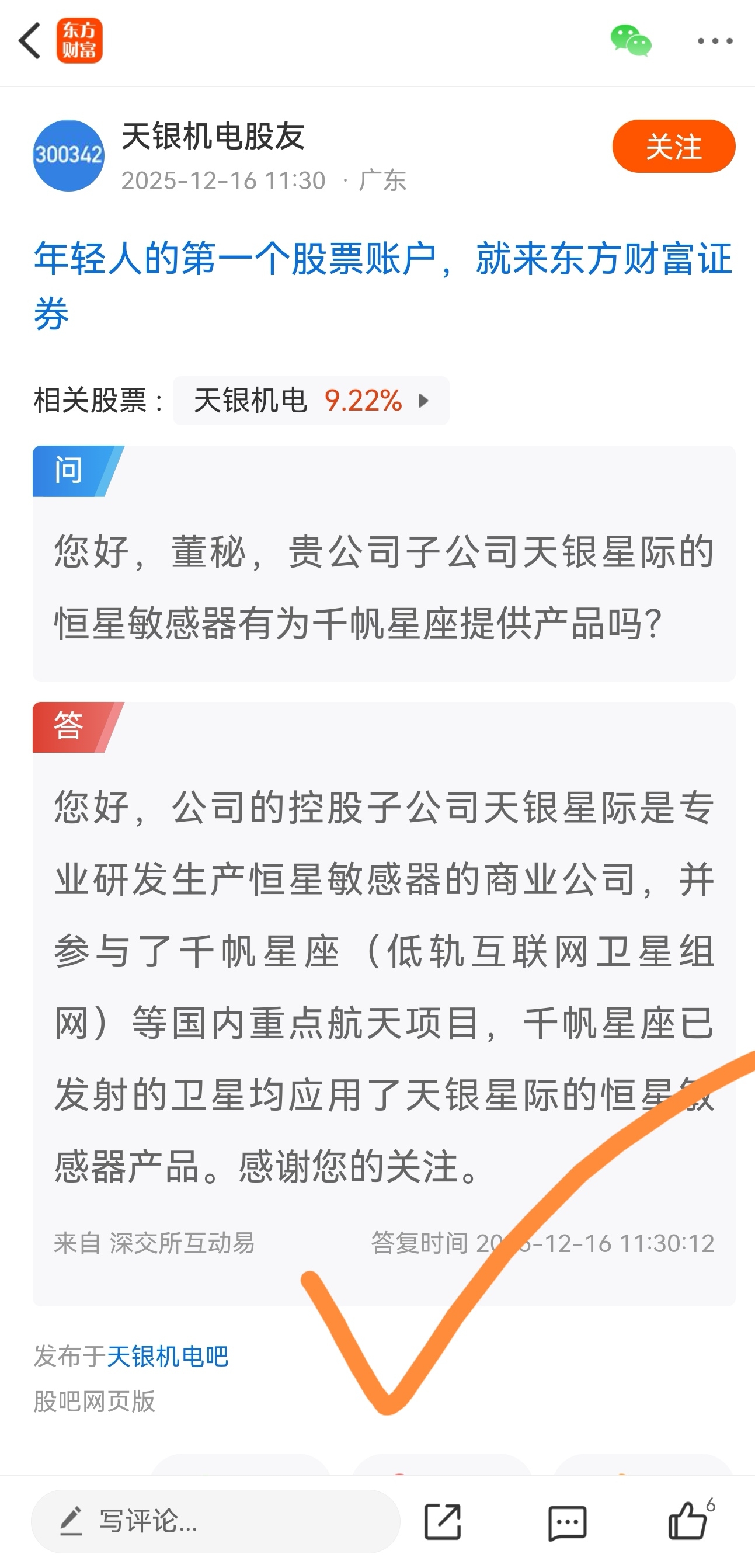 $天银机电(SZ300342)$ 11月26日说没有和千帆星座合作,12月16日就说有合作。现在说没有和space X合作。以后又说有,这么出尔反尔的吗哈哈