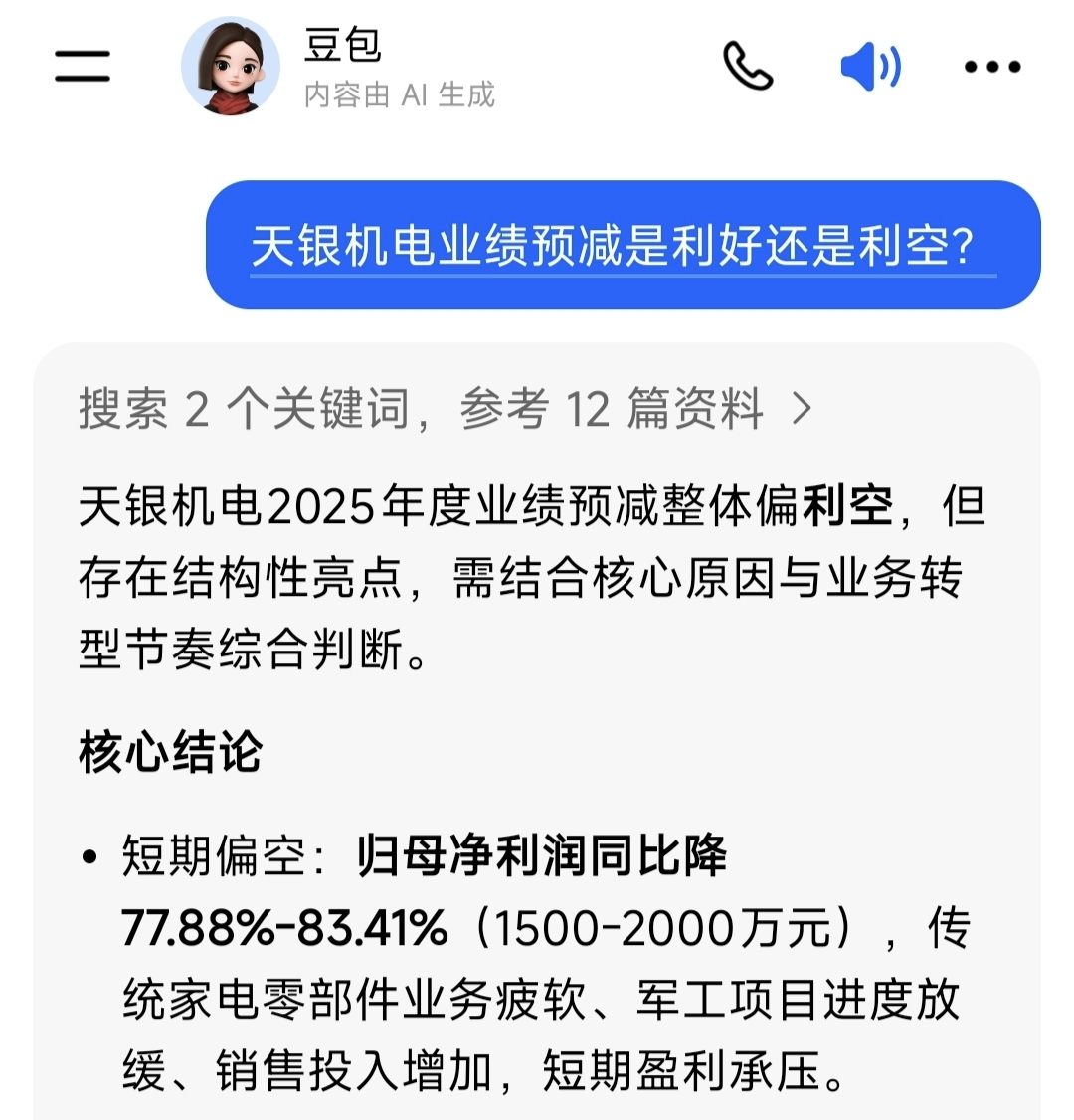 $天银机电(SZ300342)$ 谁还吹牛,说了利空业绩不行,这是豆包老师说的利空,可别骂我