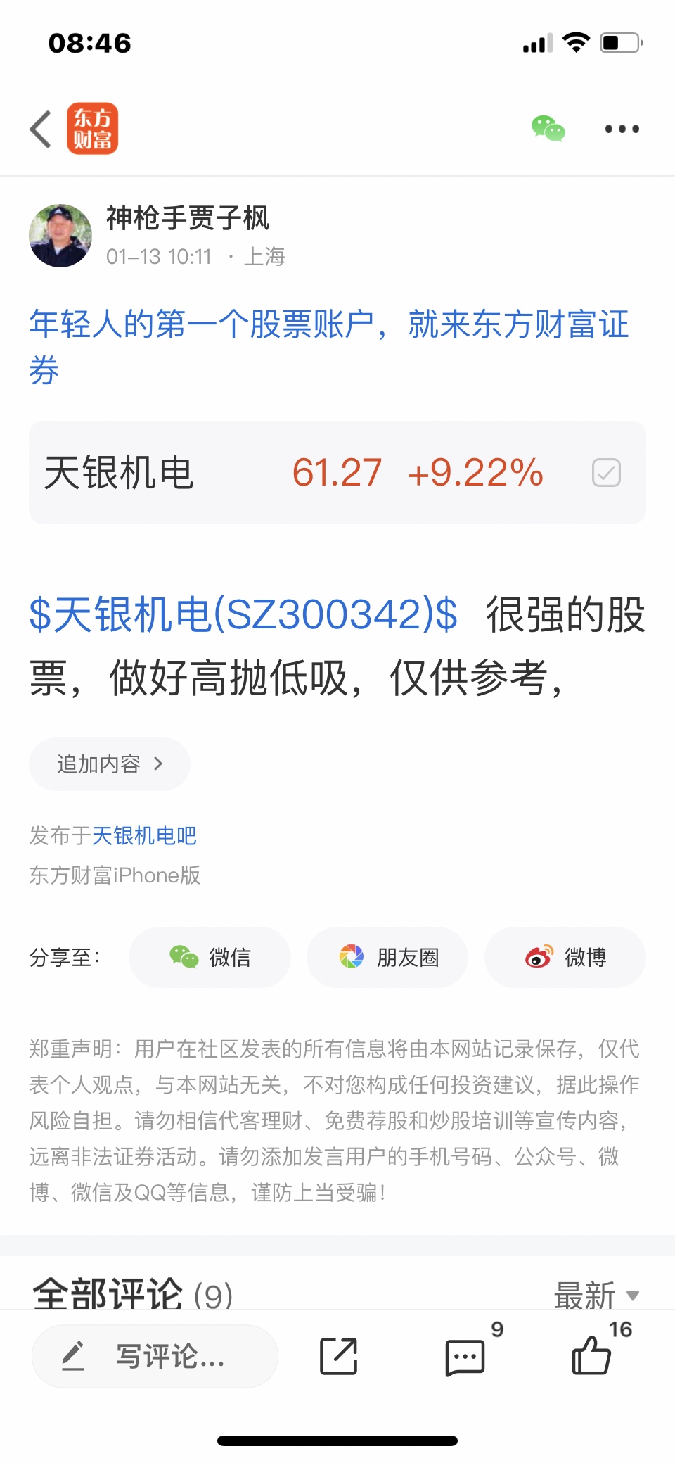 $天银机电(SZ300342)$ 这个股是我一月十三号看涨的股票,大家不要追高买入,必须要做好高抛低吸,我是不推荐股票的,大家不要跟我买卖股票,大家自己买什么样的股票是和我无关的,因为我是免费和大家一起交流股票,我是和大家一起学习的,我的观点仅供参考,不构成任何投资建议,投资有风险,风险要自己承担后果,