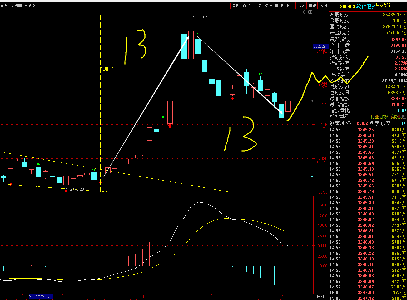 在周末的文档里面给大家讲了软件服务指数是从高点回调下来的第13个交易日,如果按照时间对称轴去计算,昨天我还在文章里面说了今天软件相关的科技,它就是向上的变盘点,今天软件服务指数上涨3%收盘,昨天我还说了软件里面昨天在软件里面个股跌幅大多数都在1%至3%之间,昨天有色金属和半导体都是领跌的,说了这意味着是有色金属半导体里面资金在慢慢向软件方向转移,在高位的半导体也有资金出逃在往 AI应用以及电气设备方向转移,大家也看到了今天的寒武纪盘中出现了大跌