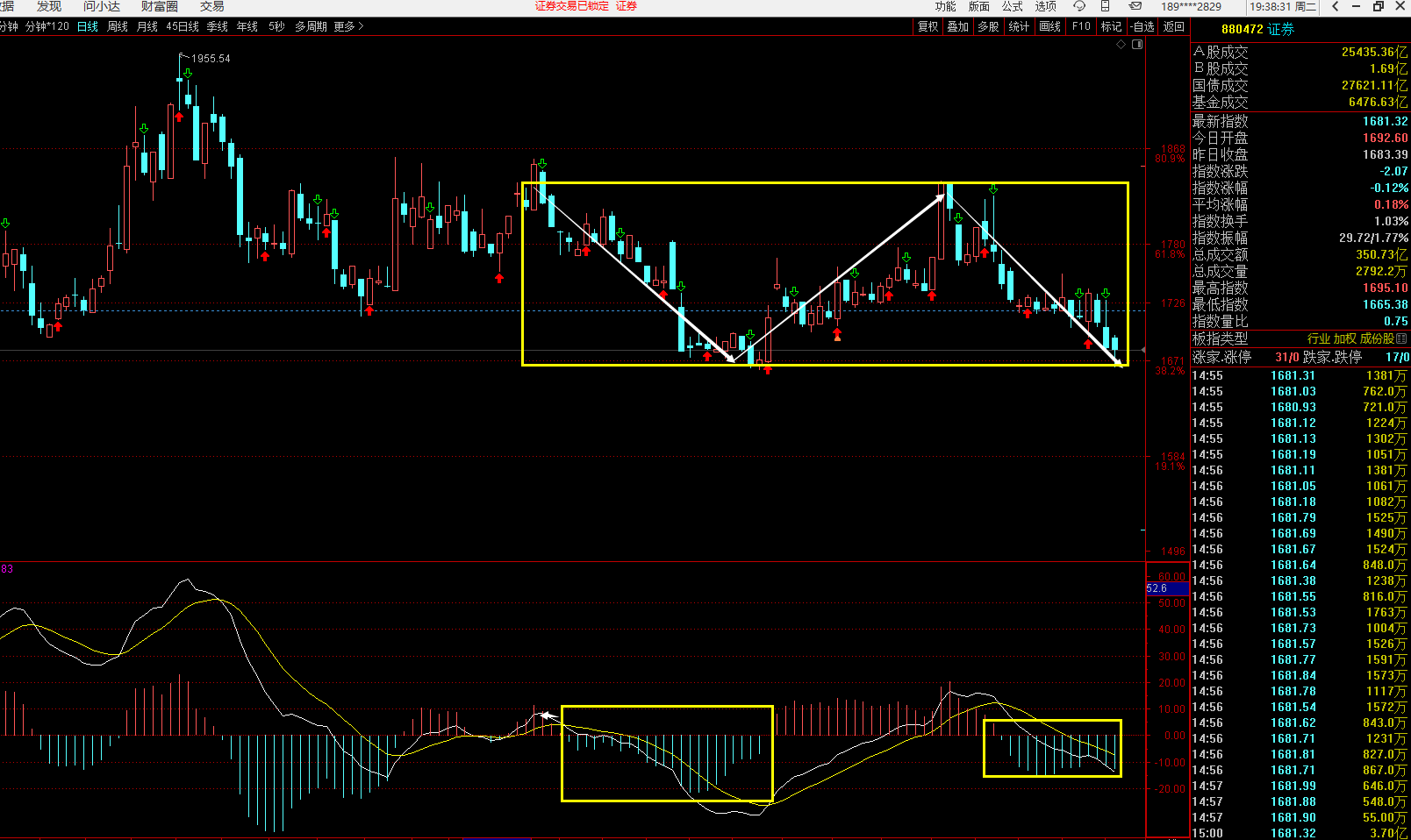 昨天给大家讲了今天券商会在233天线位置止跌企稳开始反弹。今天券商指数踩了一下250天线然后又拉起来了,个人认为这个地方券商指数周线日线看盘回调已经结束,这个地方从明天开始券商可能会有向上变盘,走出一个波段行情,星期三券商会有大一点的阳线出来,但是券商目前是不会有大行情。券商日K线里面这个位置可以看成是一个双底形态,同时也是日线的MACD底背离,还是一个大的ABC的结构