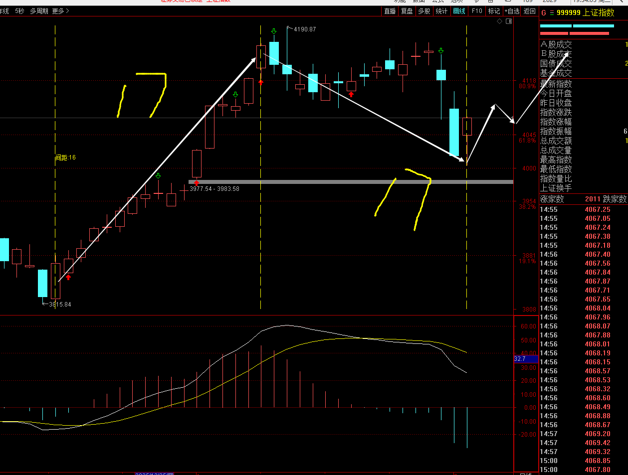 昨天在文档里面给大家讲了今天可能会回补3977点的跳空缺口,今天的最低点4002点,但是没有回补下方缺口,今天指数反而上涨了52个点,收盘点位在30天均线的上方,这个我在昨天在直播间也给大家讲了指数快速下跌短期可能会迎来一个修复,对于下面的3977点的跳空缺口会不会回补,目前还不能完全确定,如果今天是回补了3977点的跳空缺口再拉起来那就是非常完美,现在目前这个地方还存在着一个隐患,不排除反弹之后再次下跌回补3977的跳空缺口。今天的反弹依然是看多。