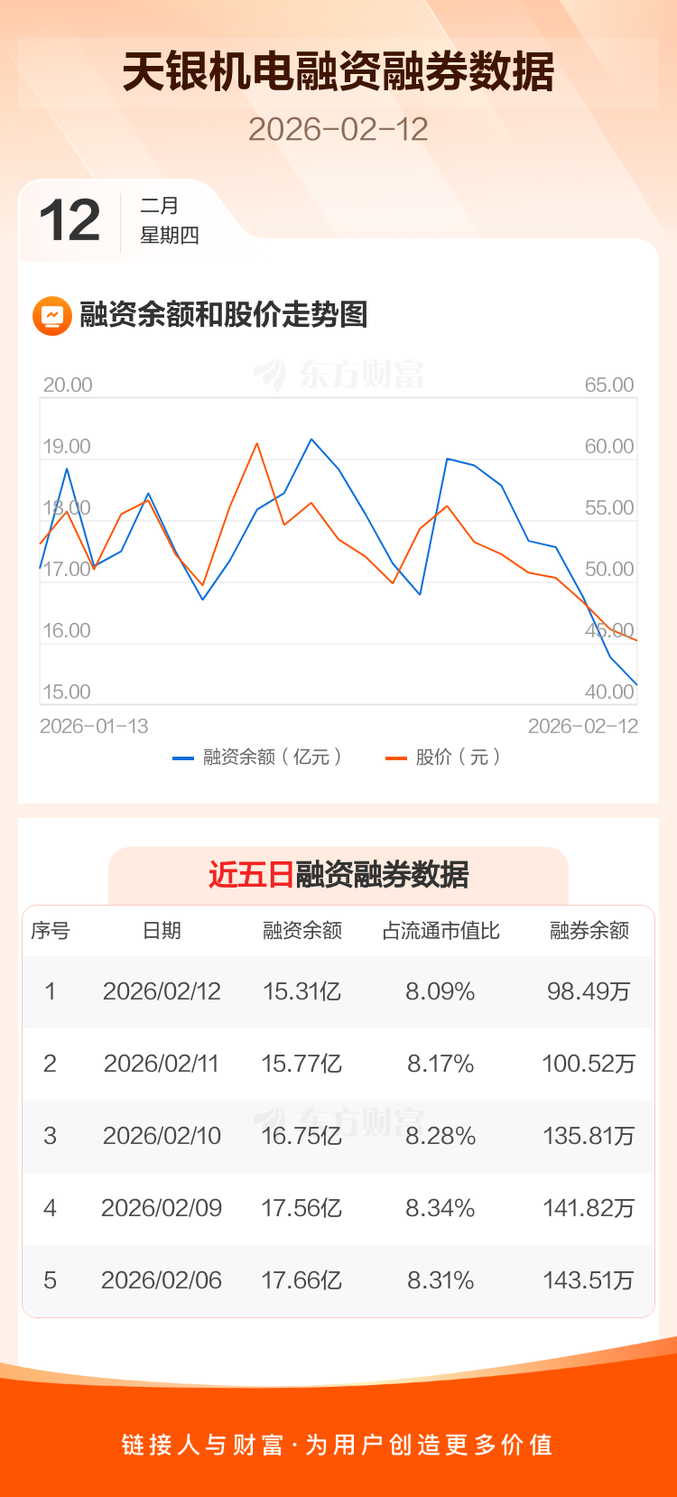 交易所最新数据显示,天银机电于2026年2月12日获融资买入1.75亿元,融资偿还2.21亿元,当日融资净偿还4617.1万元。目前,该股融资余额15.31亿,占流通市值比例为8.09%。