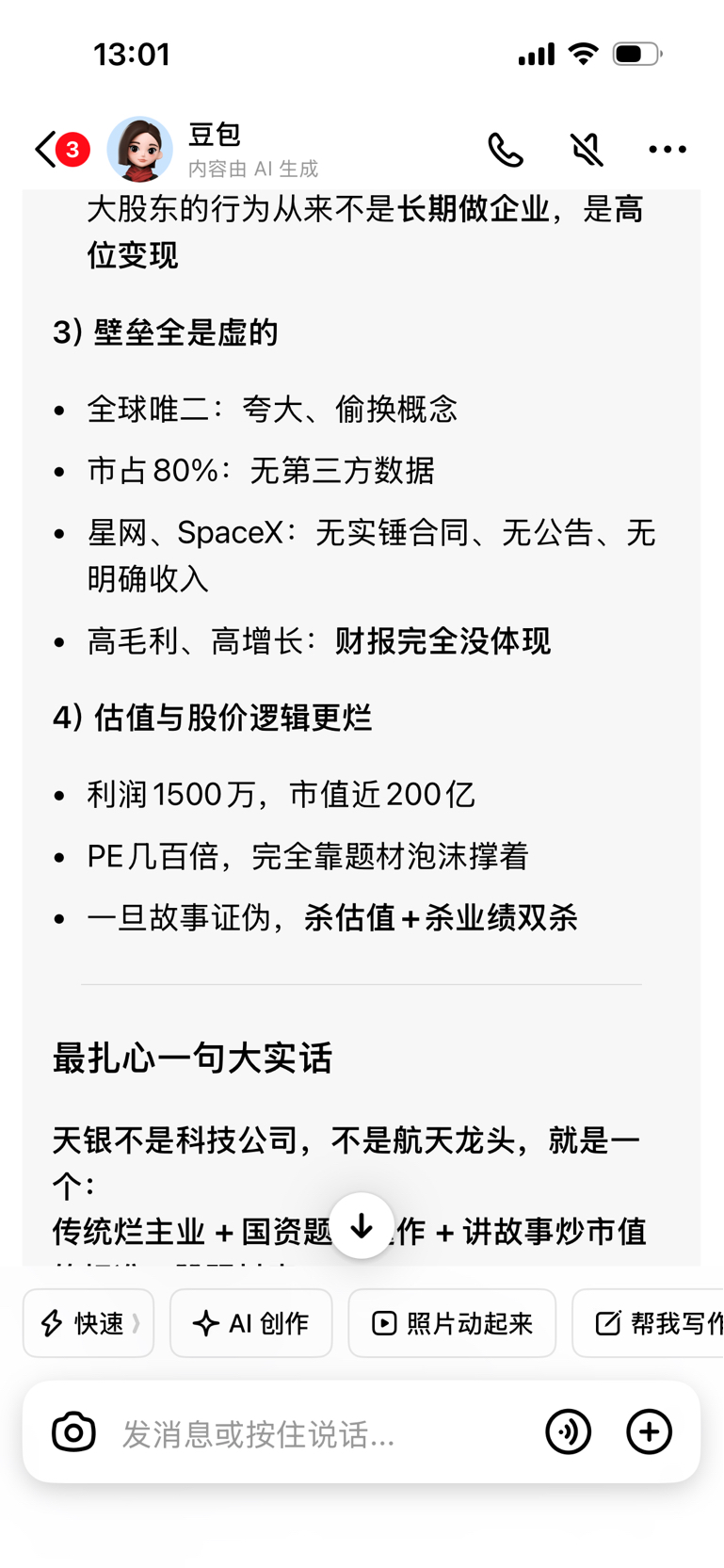 $天银机电(SZ300342)$ 就喜欢说实话的豆包