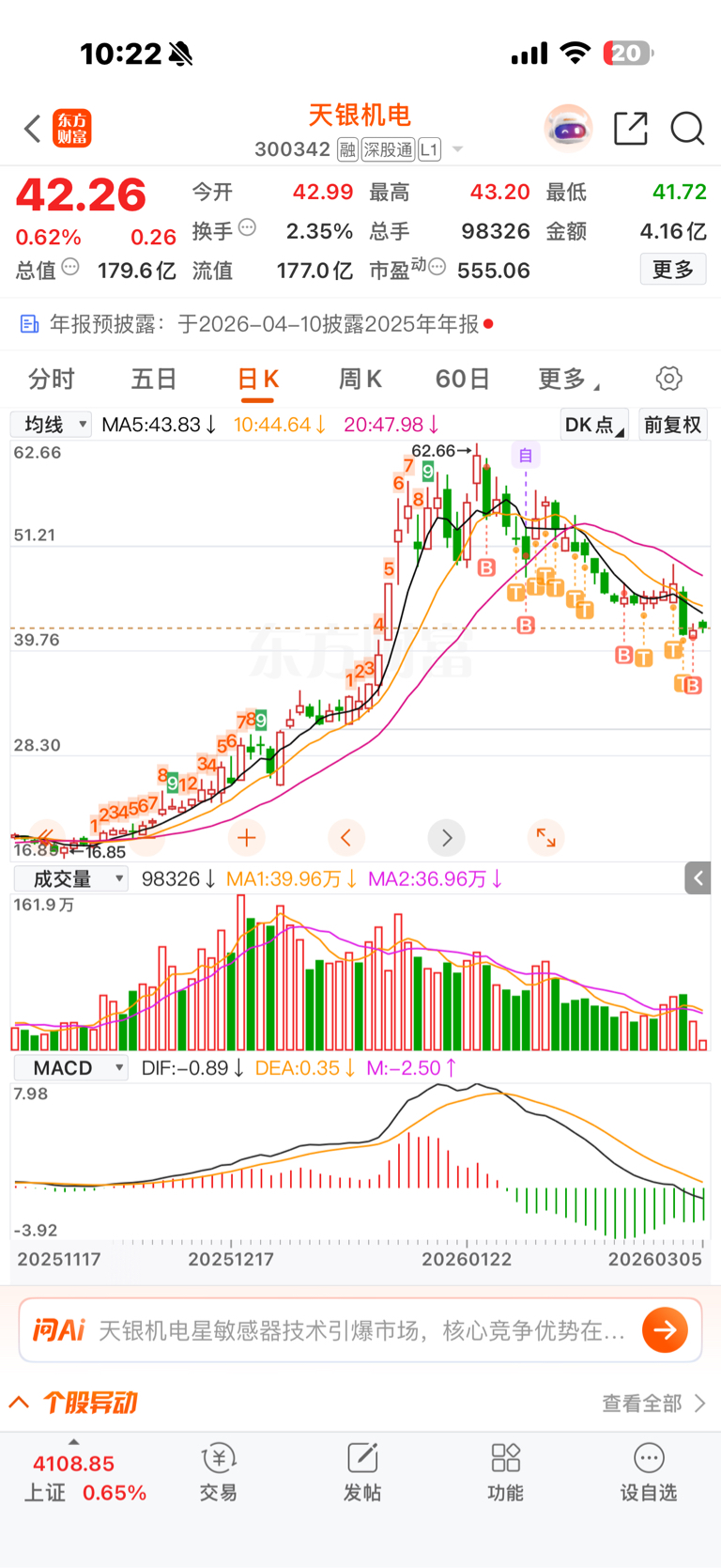 $天银机电(SZ300342)$ 我对这个票彻底无语了,到现在亏28个点,一路下跌趋势,根本扶不起来,做t都没法做