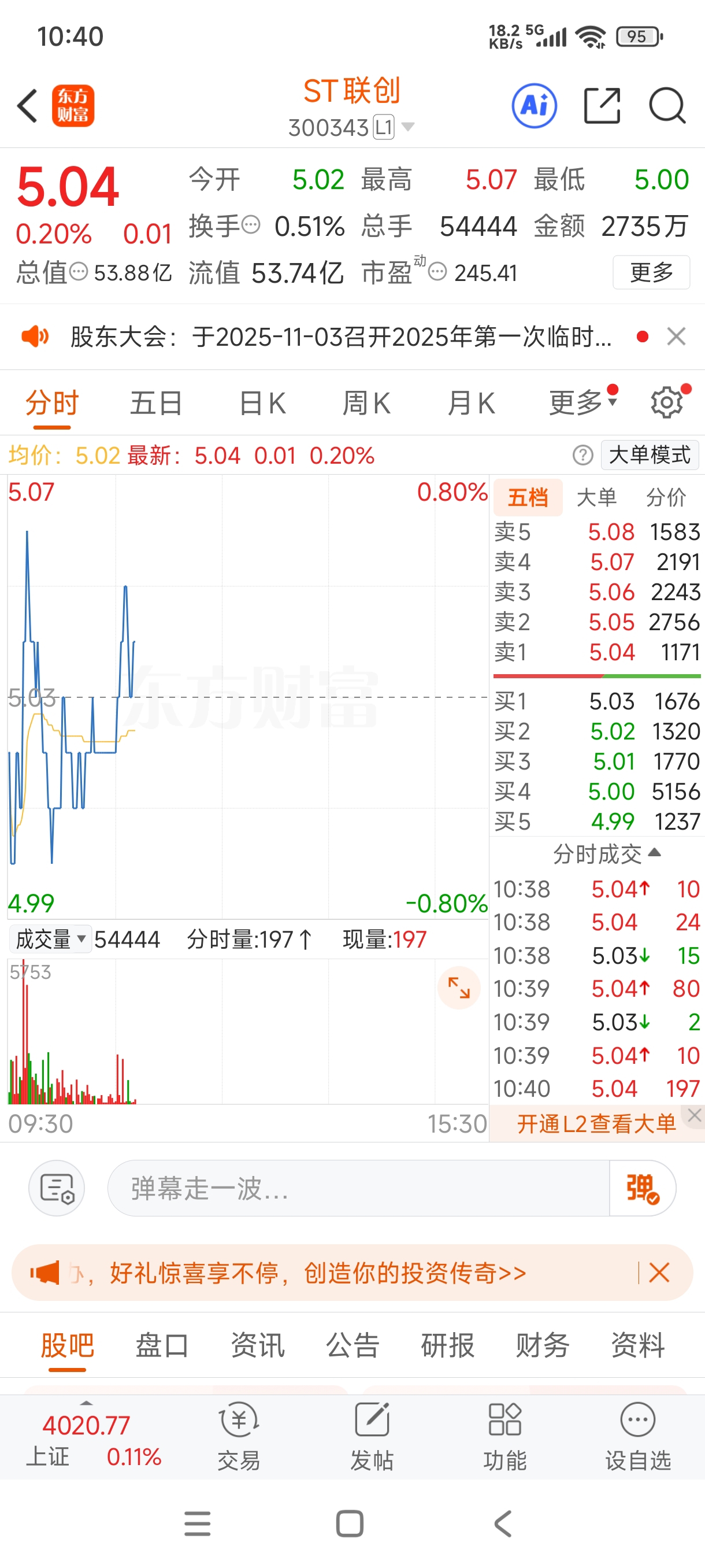 $ST联创(SZ300343)$ 红了,红了,,大家快看,,我截到联创红色的图啦!!!大家看!