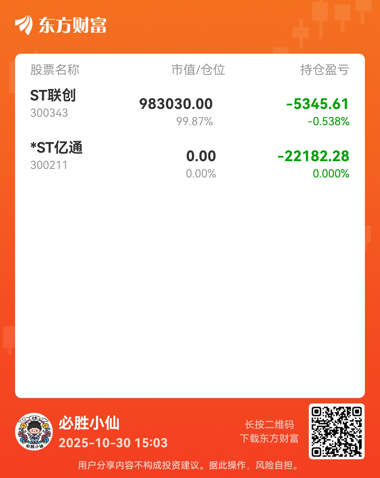 $ST联创(SZ300343)$ $ST股(BK0511)$ $*ST亿通(SZ300211)$ 亲,百万魔咒,真避不开么?买了三次小通,赚1次亏2次,算了,换换手气吧。4000点和小散似乎没啥关系,反正不追高,输钱不输心情,很好的,很好的,很好的。