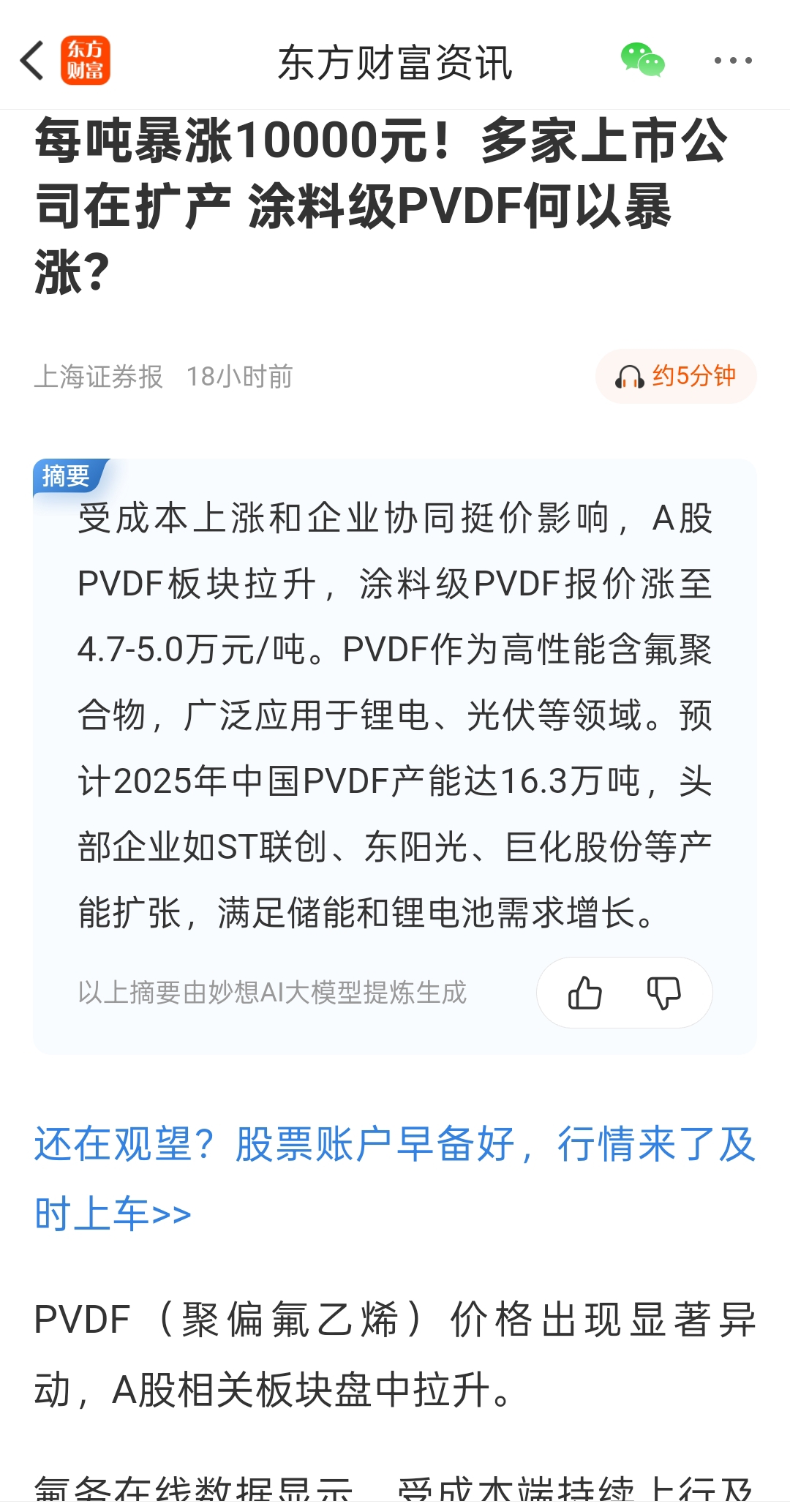 受成本上涨和企业协同挺价影响,A股PVDF板块拉升,涂料级PVDF报价涨至4.7-5.0万元/吨。PVDF作为高性能含氟聚合物,广泛应用于锂电、光伏等领域。预计2025年中国PVDF产能达16.3万吨,头部企业如ST联创、东阳光、巨化股份等产能扩张,满足储能和锂电池需求增长。