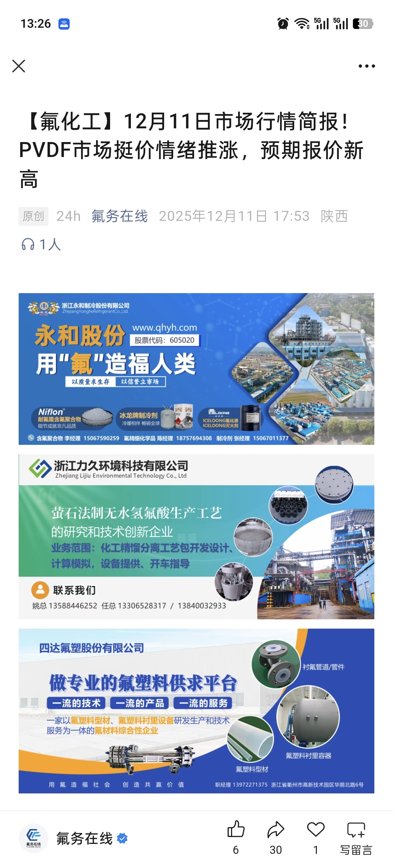 $ST联创(SZ300343)$ 【氟化工】12月11日市场行情简报!PVDF市场挺价情绪推涨,预期报价新高