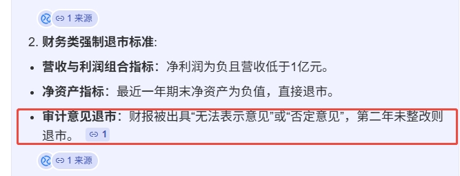 审计意见退市:财报被出具“无法表示意见”或“否定意见”,第二年未整改则退市(所以只要有整改则不用退市)