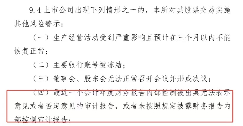 因违反9.4条第四项的规定:最近一个会计年度财务报告内部控制被出具无法表示意见或