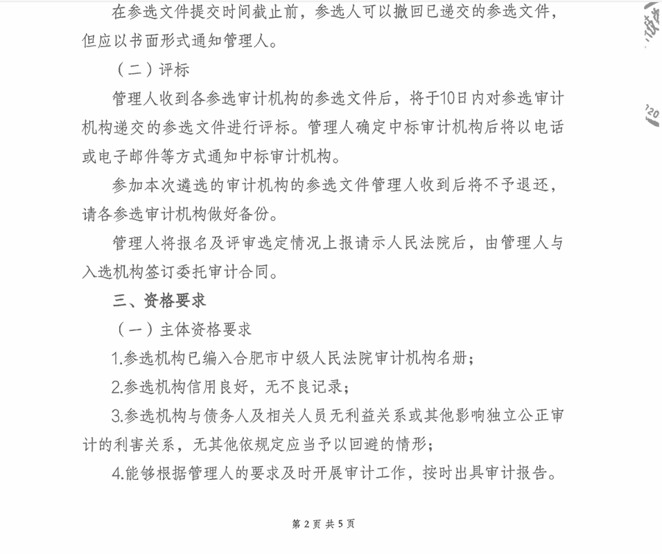 公开遴选审计机构公告9月30日选审计机构,马上2个月了,月底会更新进度。破产重整