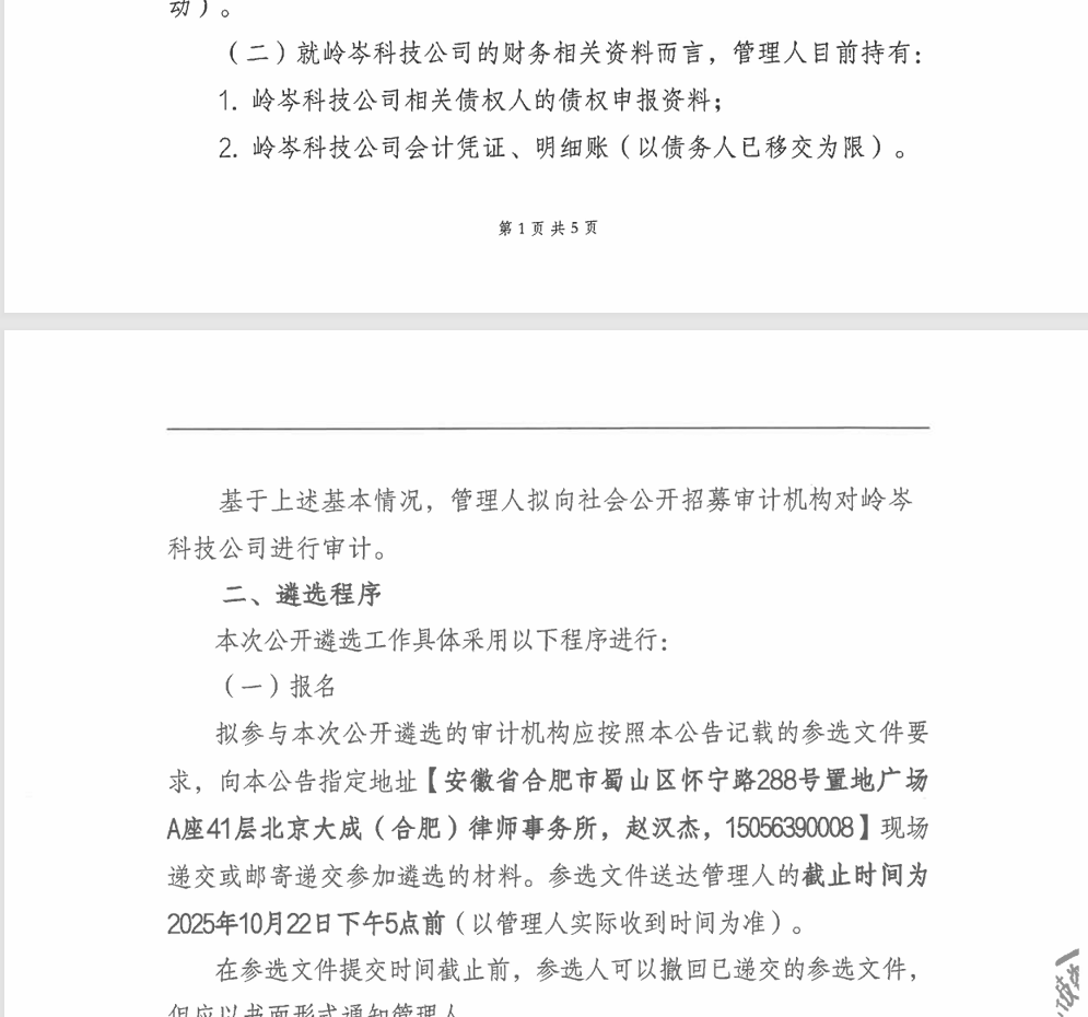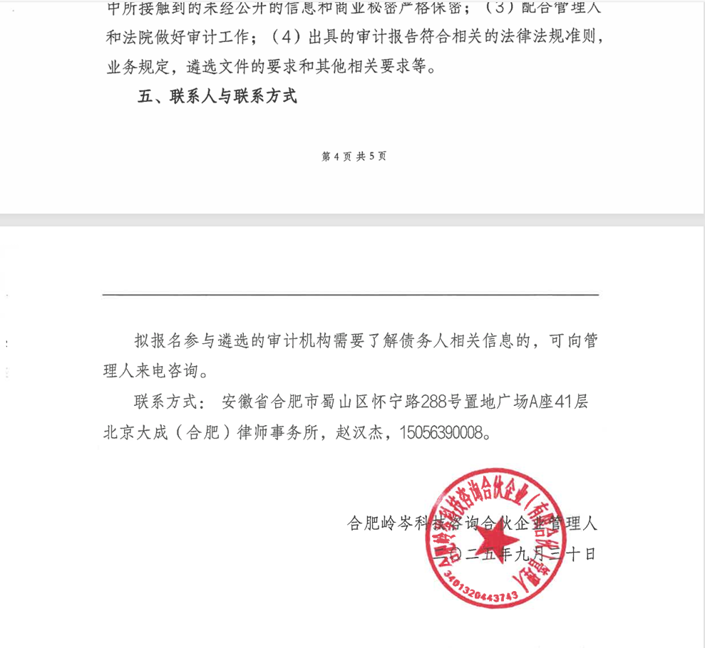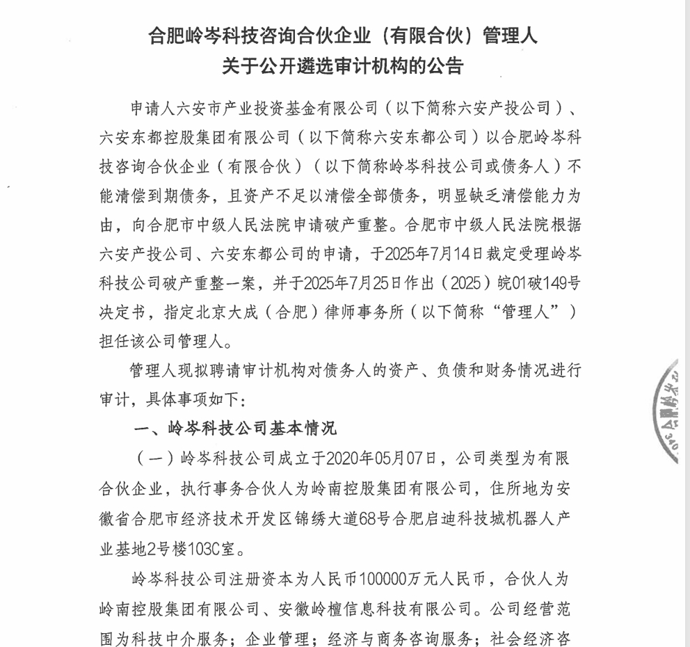 [案件公告] (2025)皖01破149号合肥岭岑科技咨询合伙企业(有限合伙)管理人