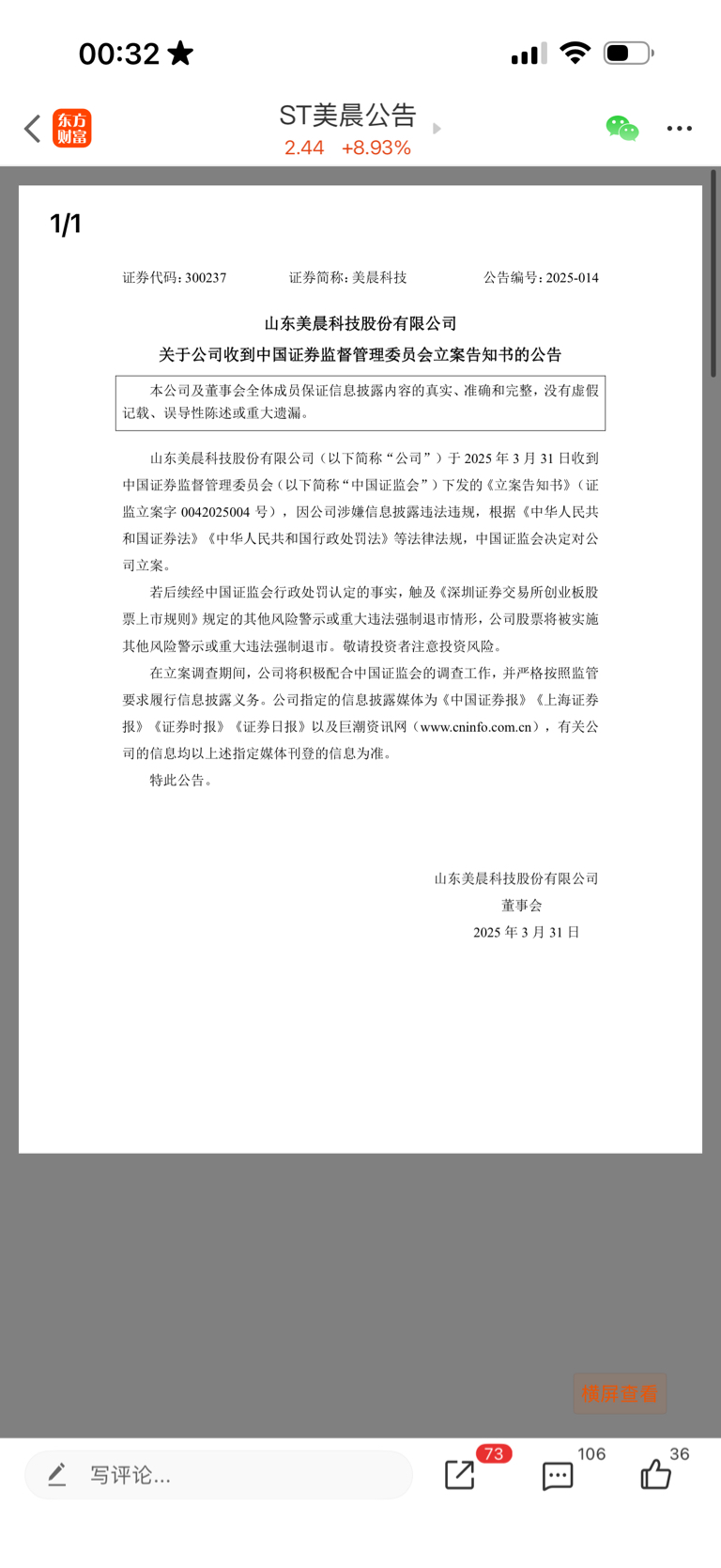 美晨立案也有提示重大违法行为最终出立案结果也没有触及退市昨日还大涨了立方加把劲一
