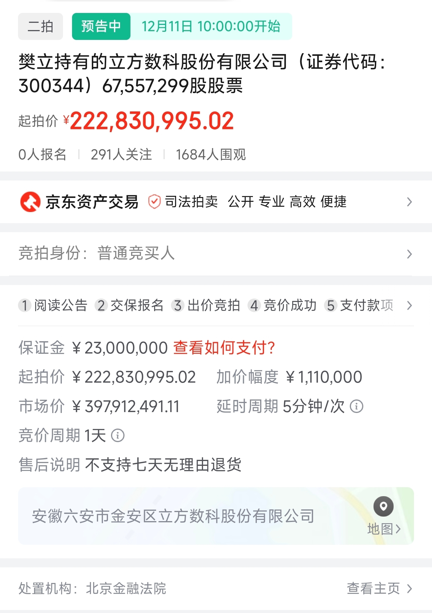 $ST立方(SZ300344)$ 起拍价每股3.3元,6755.73万股花落谁家?