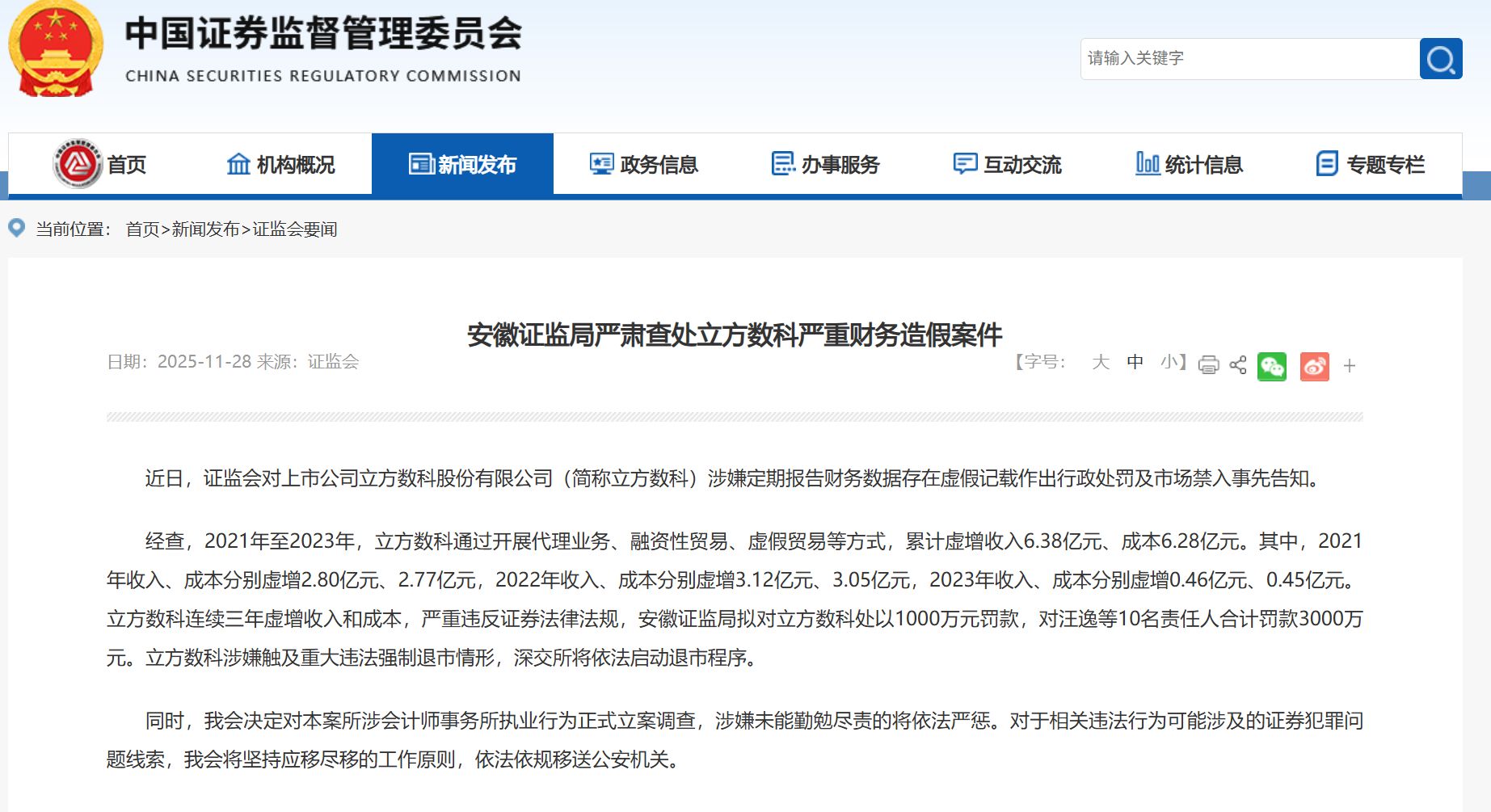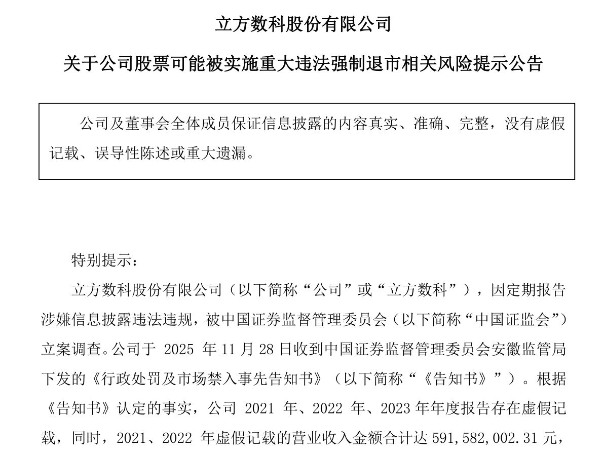 11月28日,ST立方公告称,公司于2025年11月28日收到中国证券监督管理委员会安徽监管局下发的《行政处罚及市场禁入事先告知书》,公司2021年、2022年、2023年年度报告存在虚假记载,2021、2022年虚假记载的营业收入金额合计达5.92亿元,占该两年披露的年度营业收入合计金额的50.91%。公司可能触及重大违法强制退市情形,股票可能被实施重大违法强制退市。