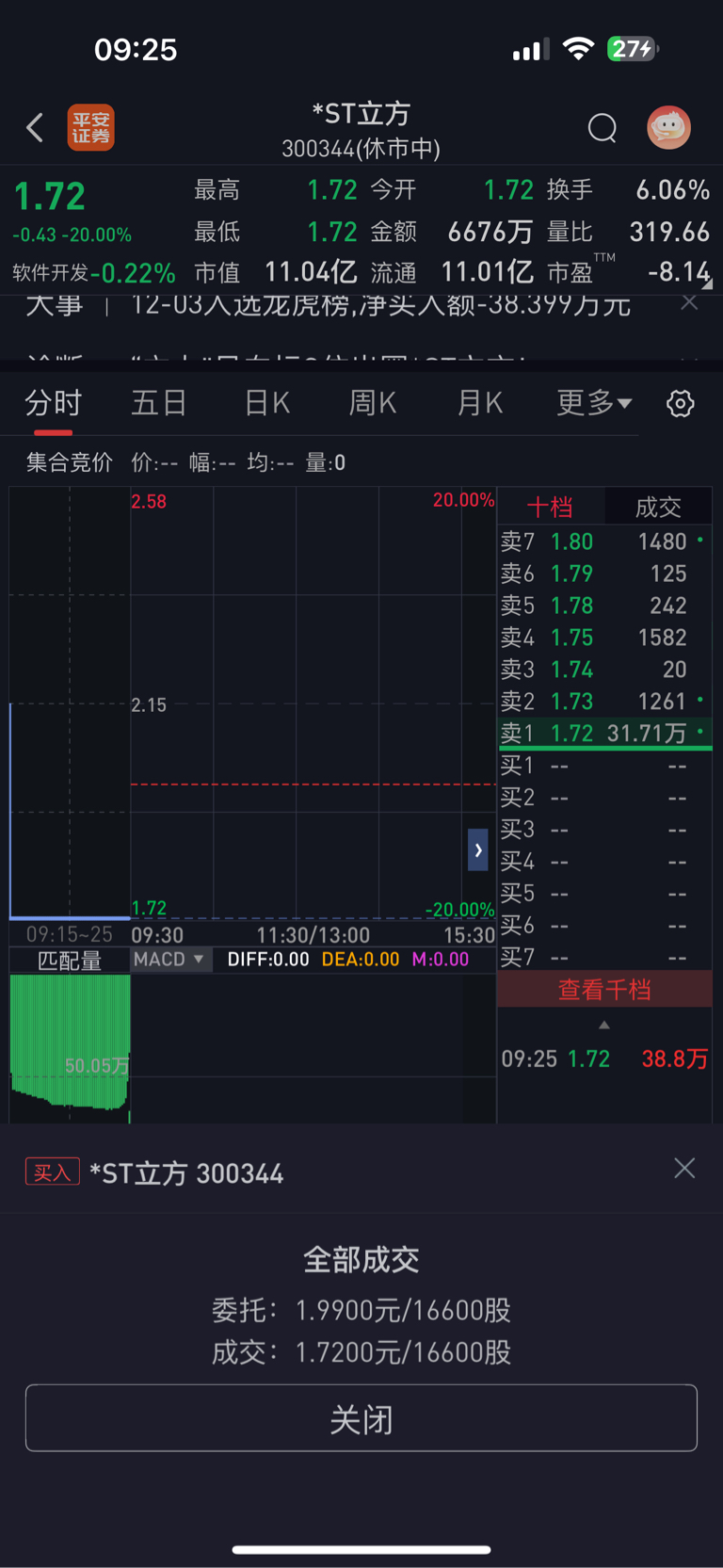 $*ST立方(SZ300344)$ 不敢买多,随便整一丁点。